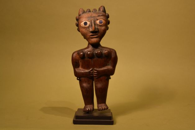Pre-Columbian Wood Figural Pendant with Inlaid Eyes of Shell and Amethyst or Sodolite