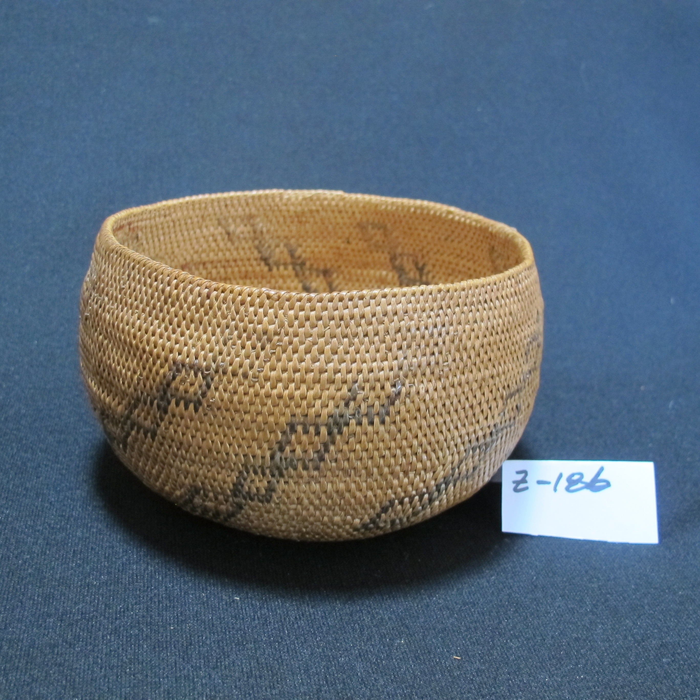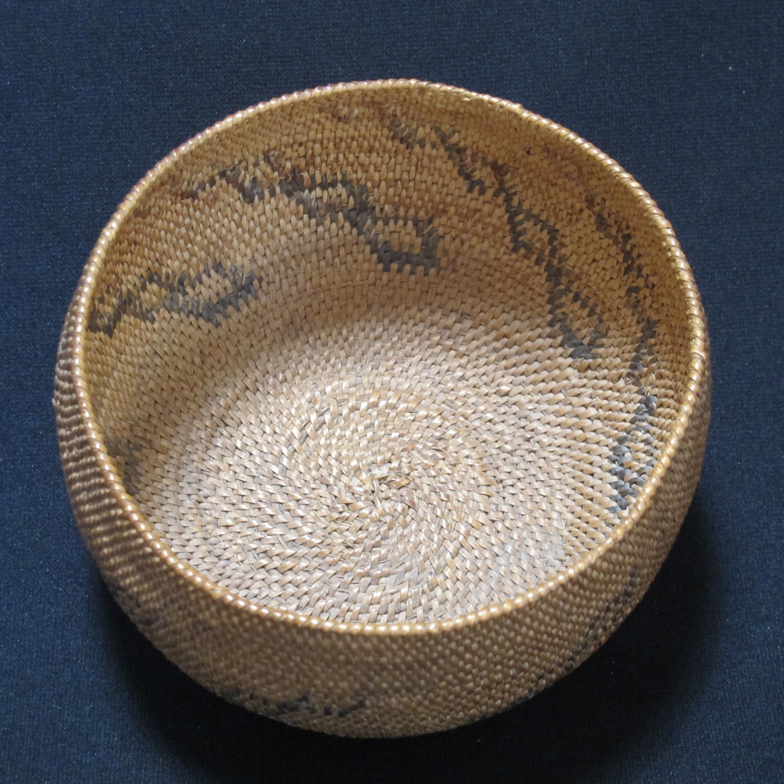 Eight up-to-right diagonals of five outlined diamonds - lower four with faded black-dyed willow and upper diamond in faded brown unpeeled willow. Coiled rim with unusual 'hitch' stitch when adding sewing material.