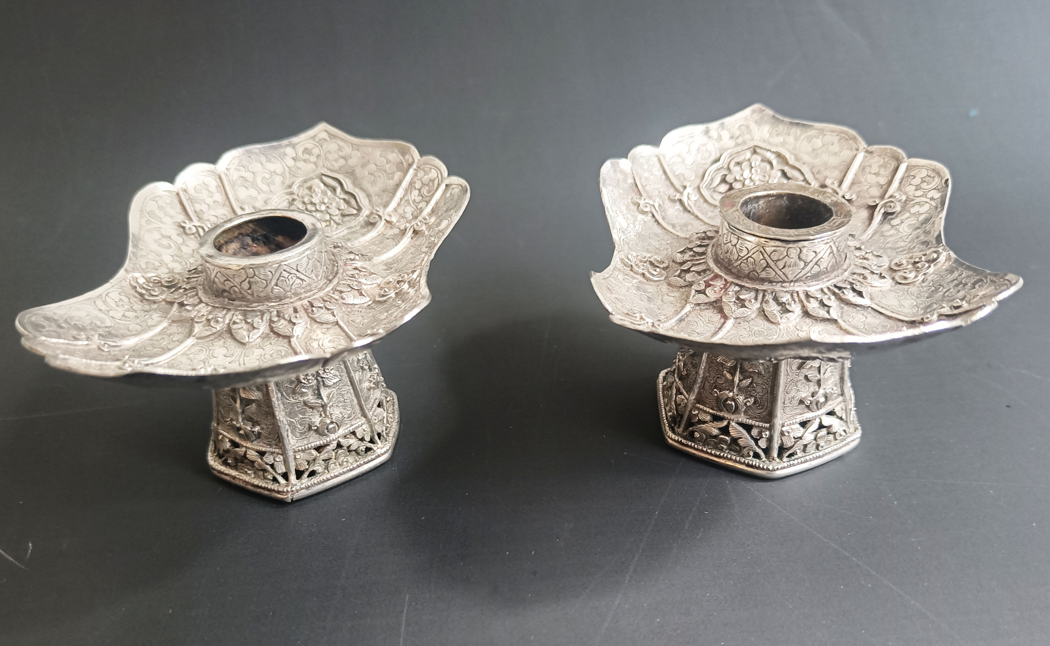 A fine pair of Sino-Tibetan Silver Lamp Stands, Late 19th–Early 20th Century