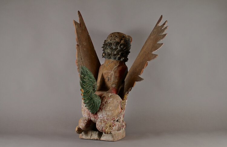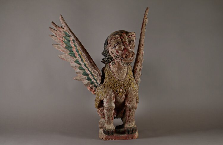 This large singha-lion is a classic animal totem of Balinese cosmology. This piece was used to support a temple post. The tail and wings were separately carved and slot into the figure.