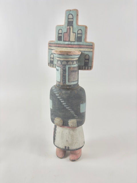 Excellent Hemis katsina by the late great Walter Howato (1921-2003). Walter was the originator of the distressed, or deliberately aged katsinam. He was influenced by antique katsinam he had seen at the Heard Museum in Phoenix. He began carving and painting in this fashion in the 1970s. He’s considered to be one of the great contributors in Hopi katsina carving history. This example is good sized at 17 1/2″ tall and 5 1/4″ wide. It shows some wear on the back from being hung on a wall for a long time. For more details on Walter’s fascinating life, see my chapter on him in “The Great Tradition of Hopi Katsina Carvers, 1880 – Present,” (Rio Nuevo Publications, 2019). From a collection in New Jersey.