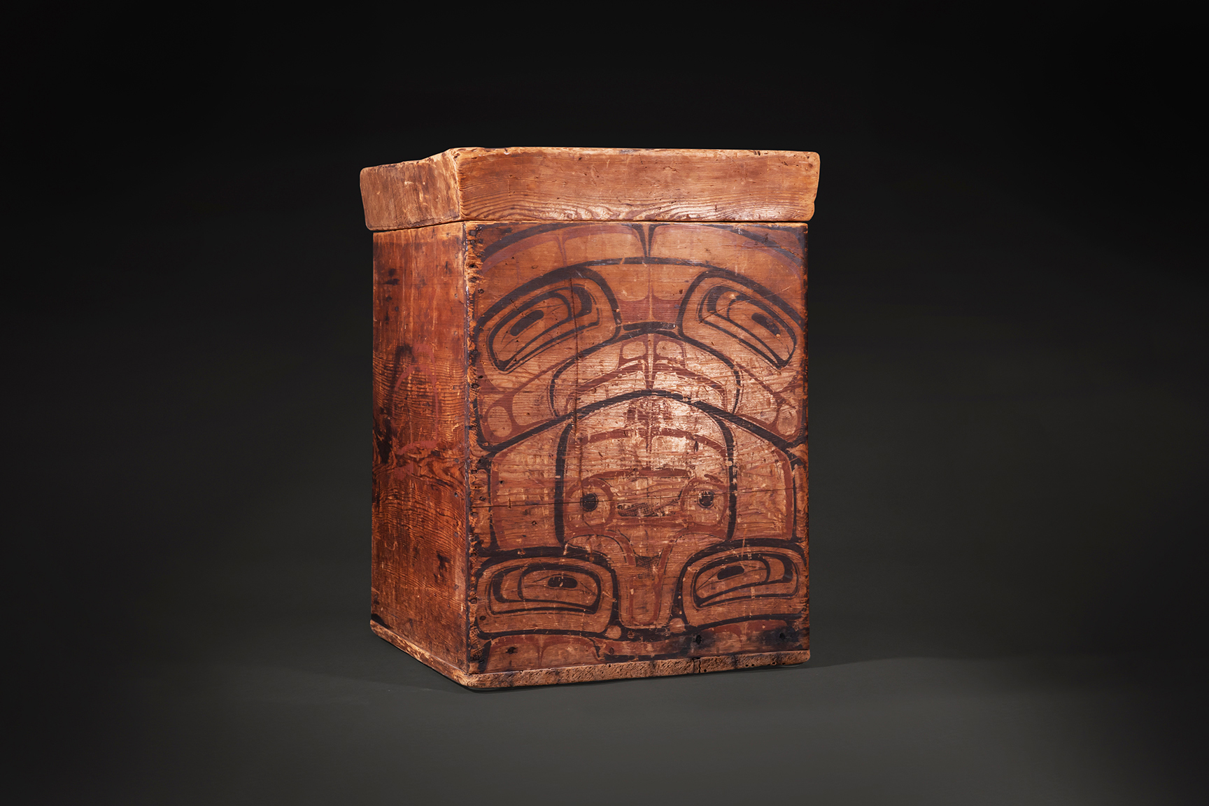 A SUPERBLY PAINTED NORTHWEST COAST LIDDED BOX, PROBABLY HEILTSUK, CIRCA MID-19th CENTURY. BELLA BELLA, BRITISH COLUMBIA.