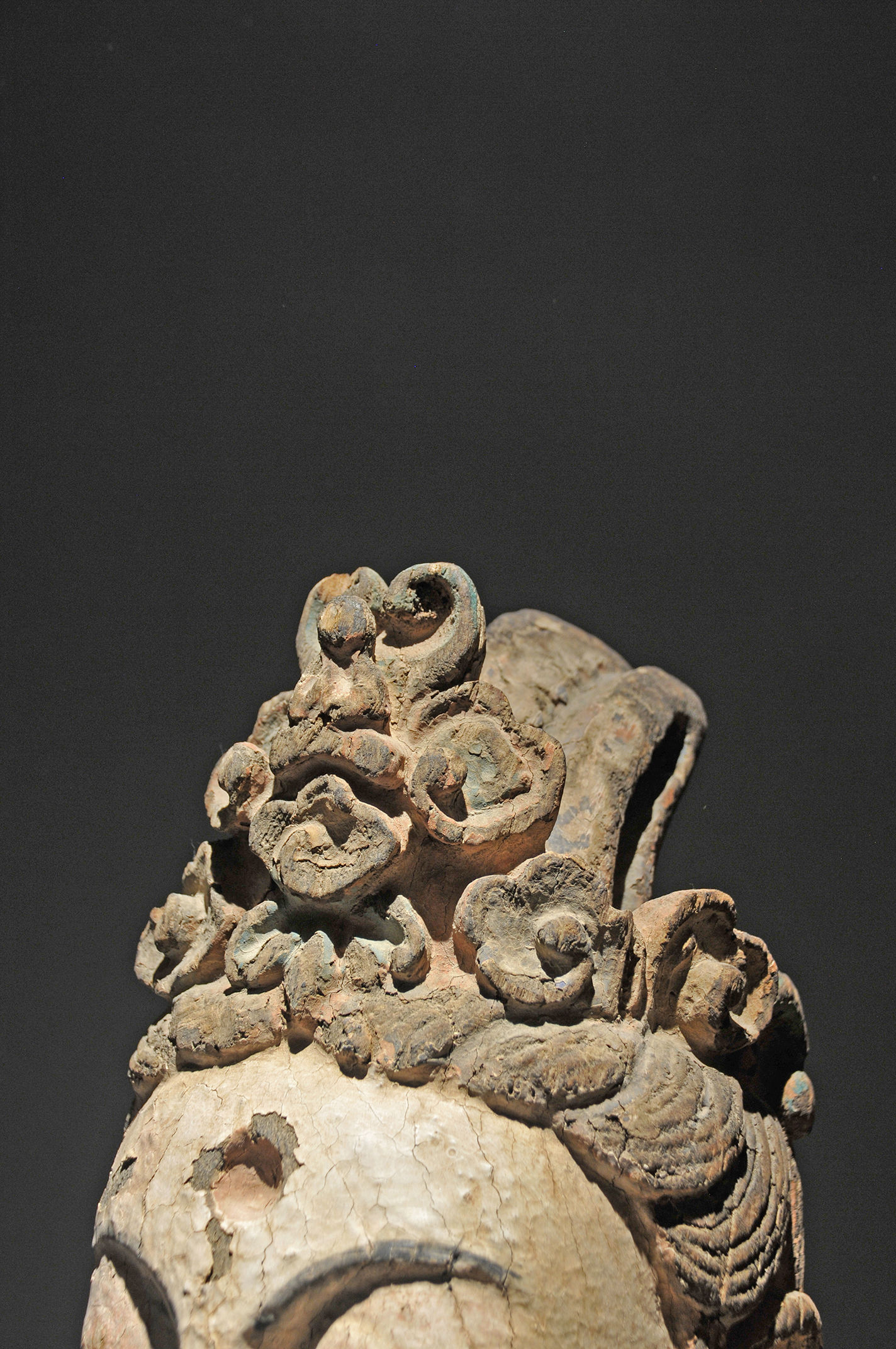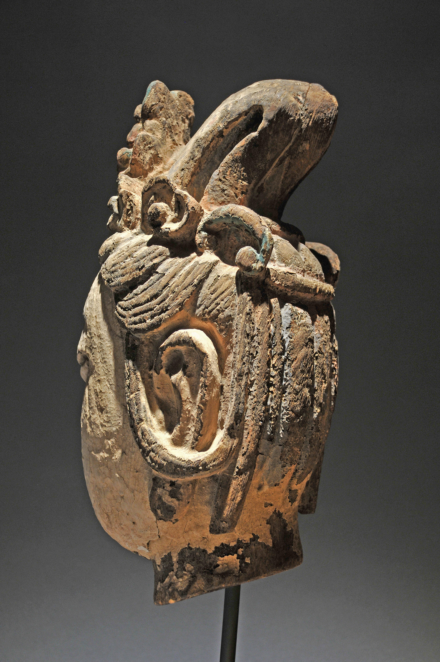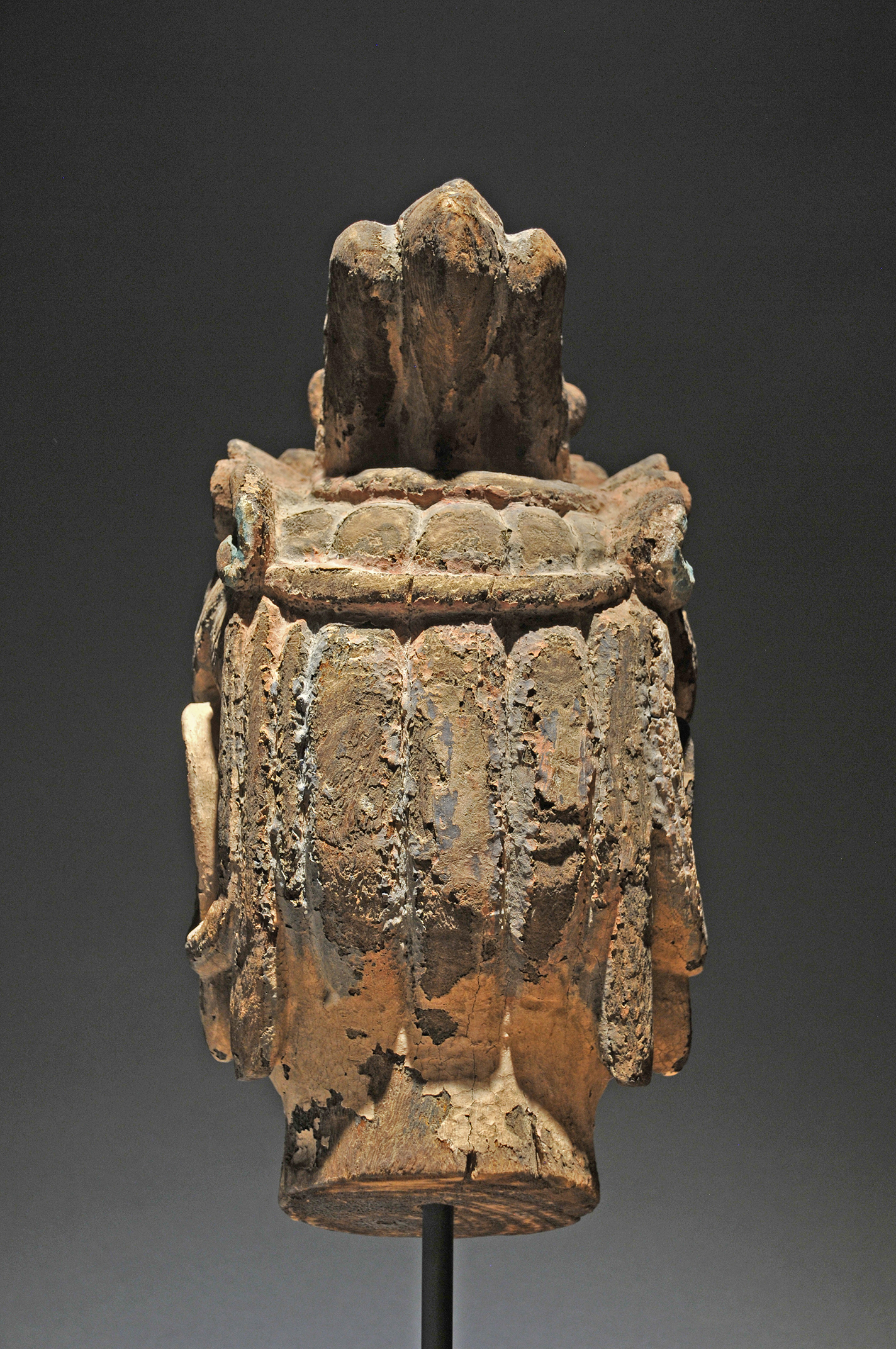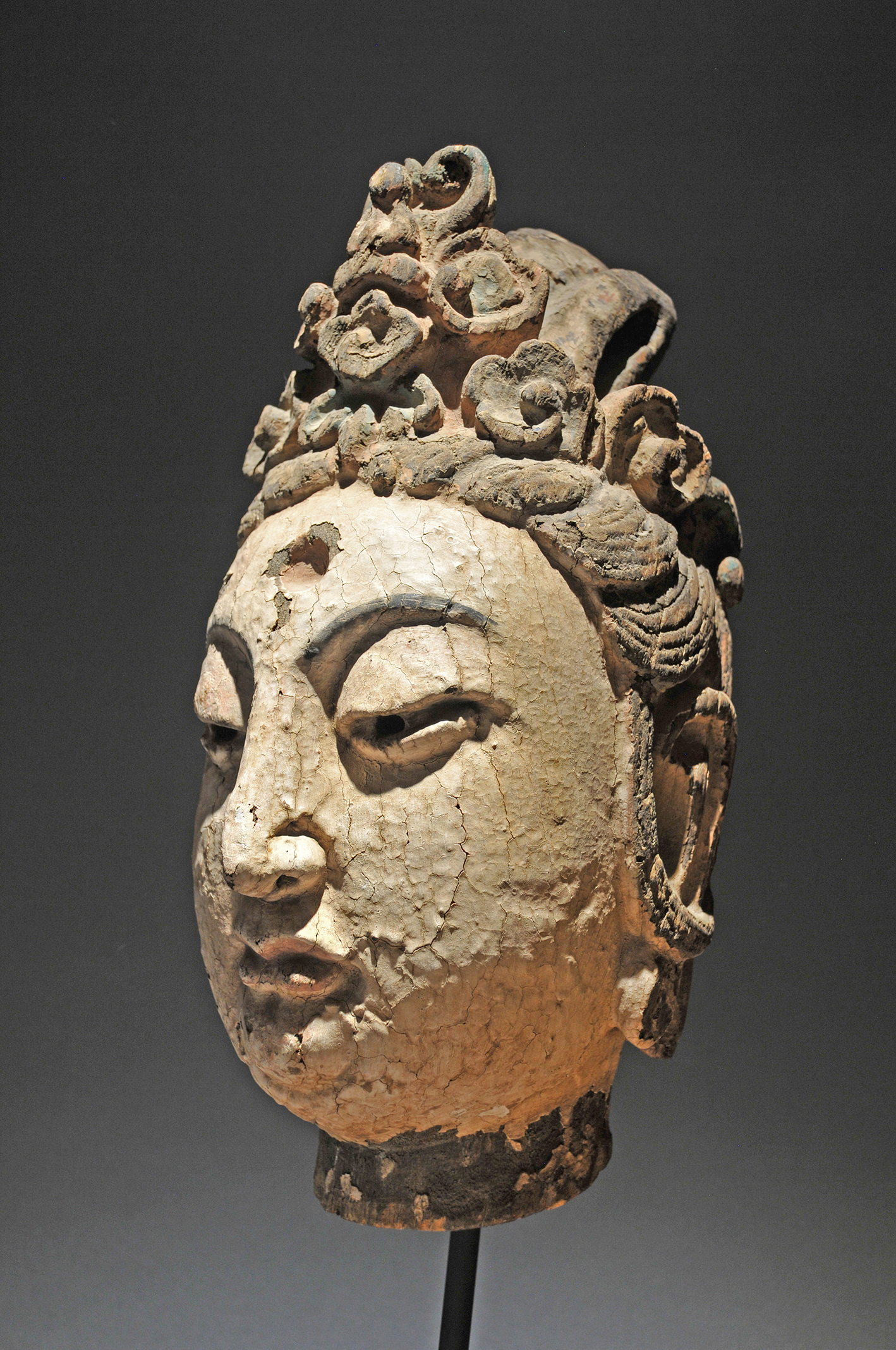 Gorgeous carved wood head of bodhisattva with original gesso.