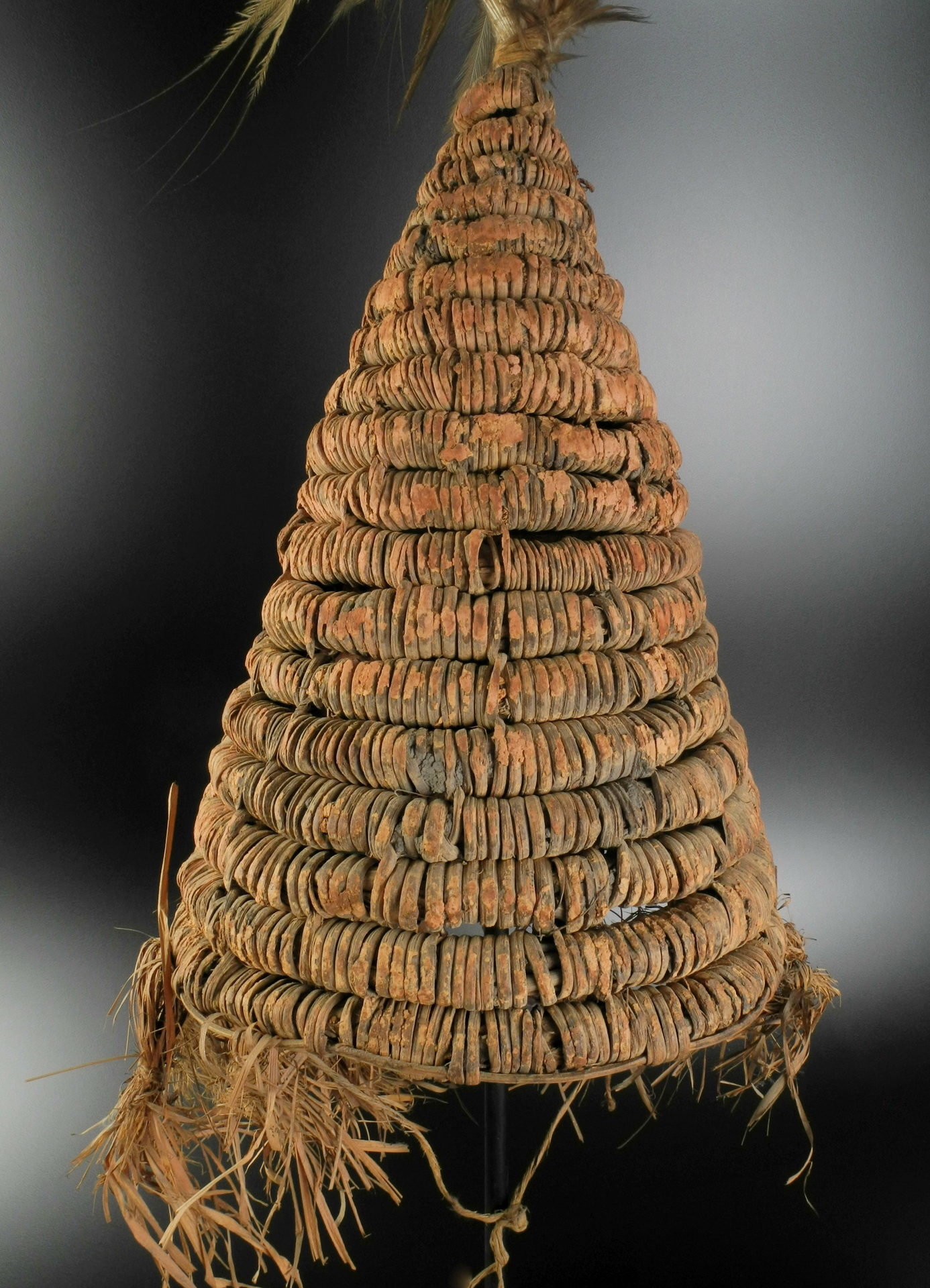 Large headgear made of coiled organic fiber, covered with dry red mud.