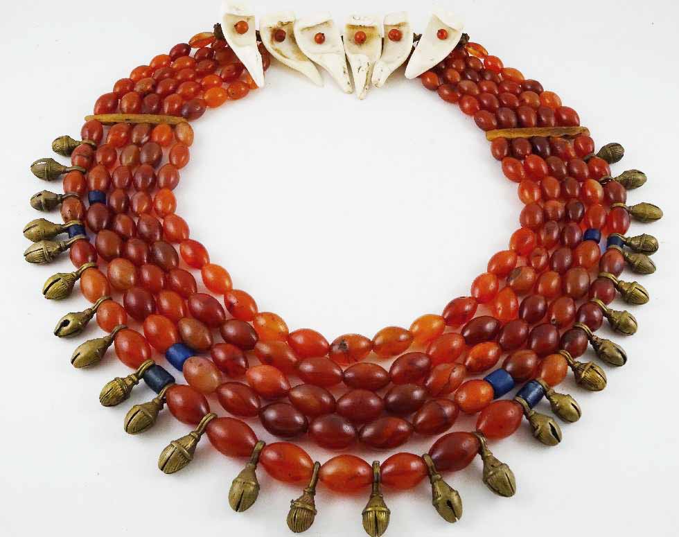 Ao Naga – elements mid-19th century– early 20th century – very wealthy woman’s high value South Indian carnelian beads and chank shell slices, with brass bells and mithun (indigenous wild ox) bone separators of Nagaland origin, made into a necklace specifically for use at festivals and occasions of great significance - 16” from macrame to bottom of lowest strand, beads 13mm – 25 mm – collected in situ, Mokokchung, Nagaland