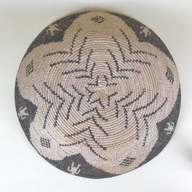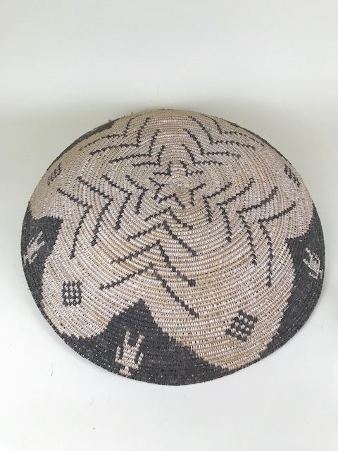 This is one of the largest baskets I’ve had. It is 24″ in diameter and 5″ deep. It is Apache and features five human figures and diverse geometric and what I call “force field” designs. It is in fine condition. I would date it to the 1940s. It is a very dramatic piece.