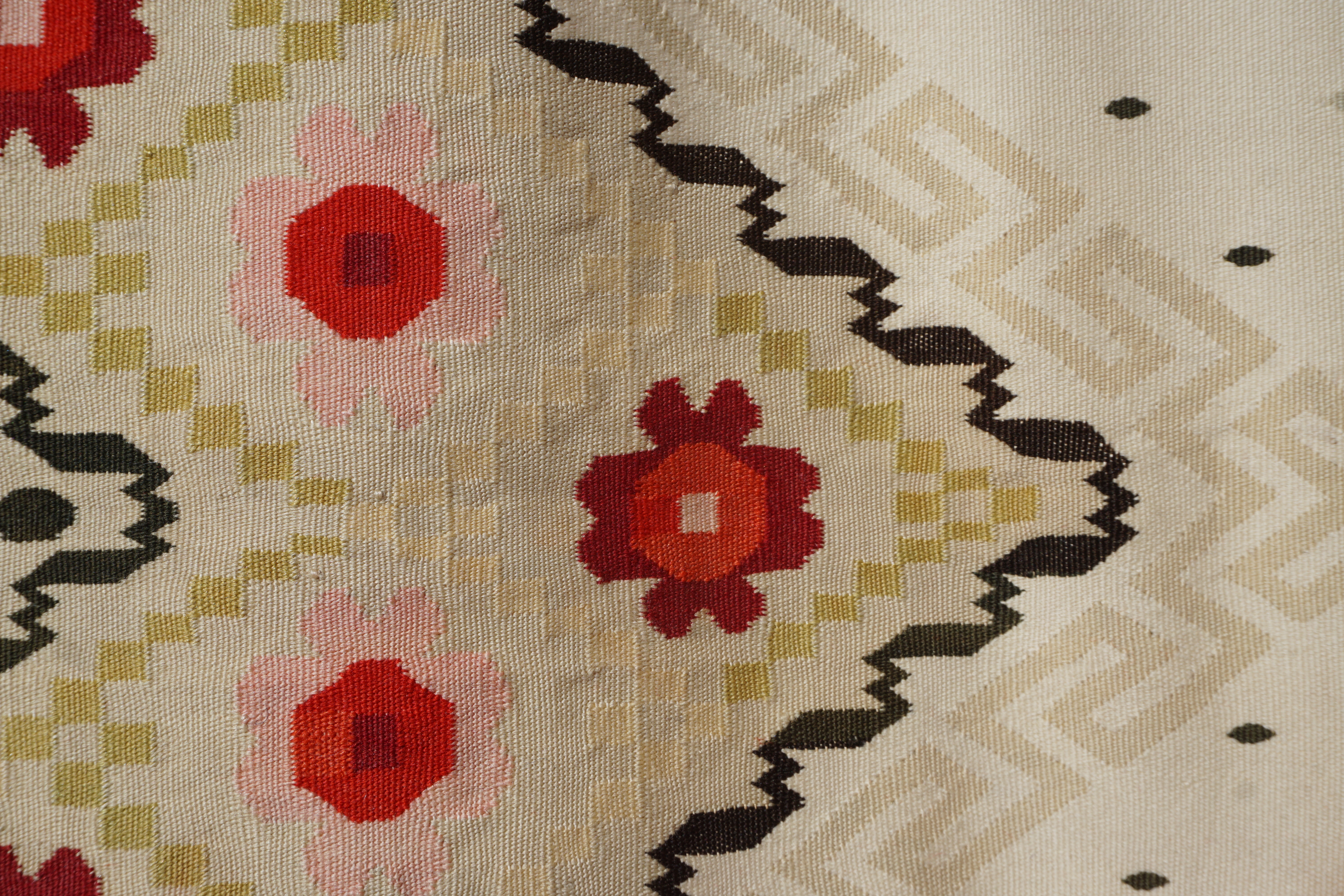 During this brief time period, the Europeans developed a dying technique for these yarns called "variegated," aka space dyed yarn, and "ombre" (in Spanish". This technique created multiple colors down the length of each strand of yarn of precise lengths in order to create complexity in the design system of the weaving without changing yarns for each color change. This sarape pre dates this yarn......color gradients in the design elements are created by using yarns of different colors, therefor, we date this sarape in the earliest years of this brief time slot.....1862-65.
