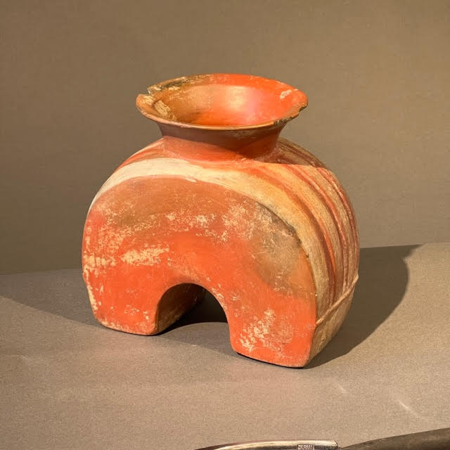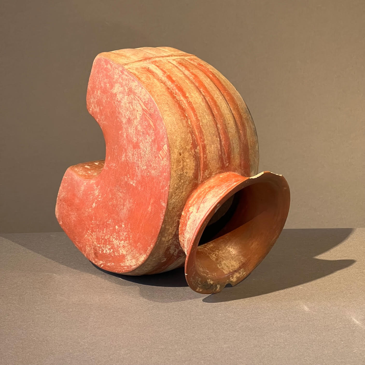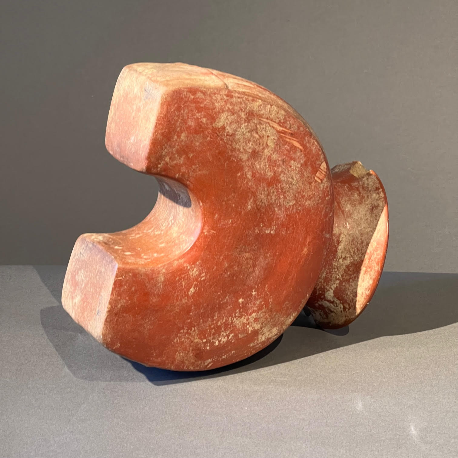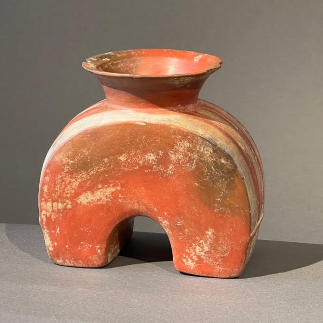 Unusual 2-legged arching vessel, ceramic, red with gray stripes along sides