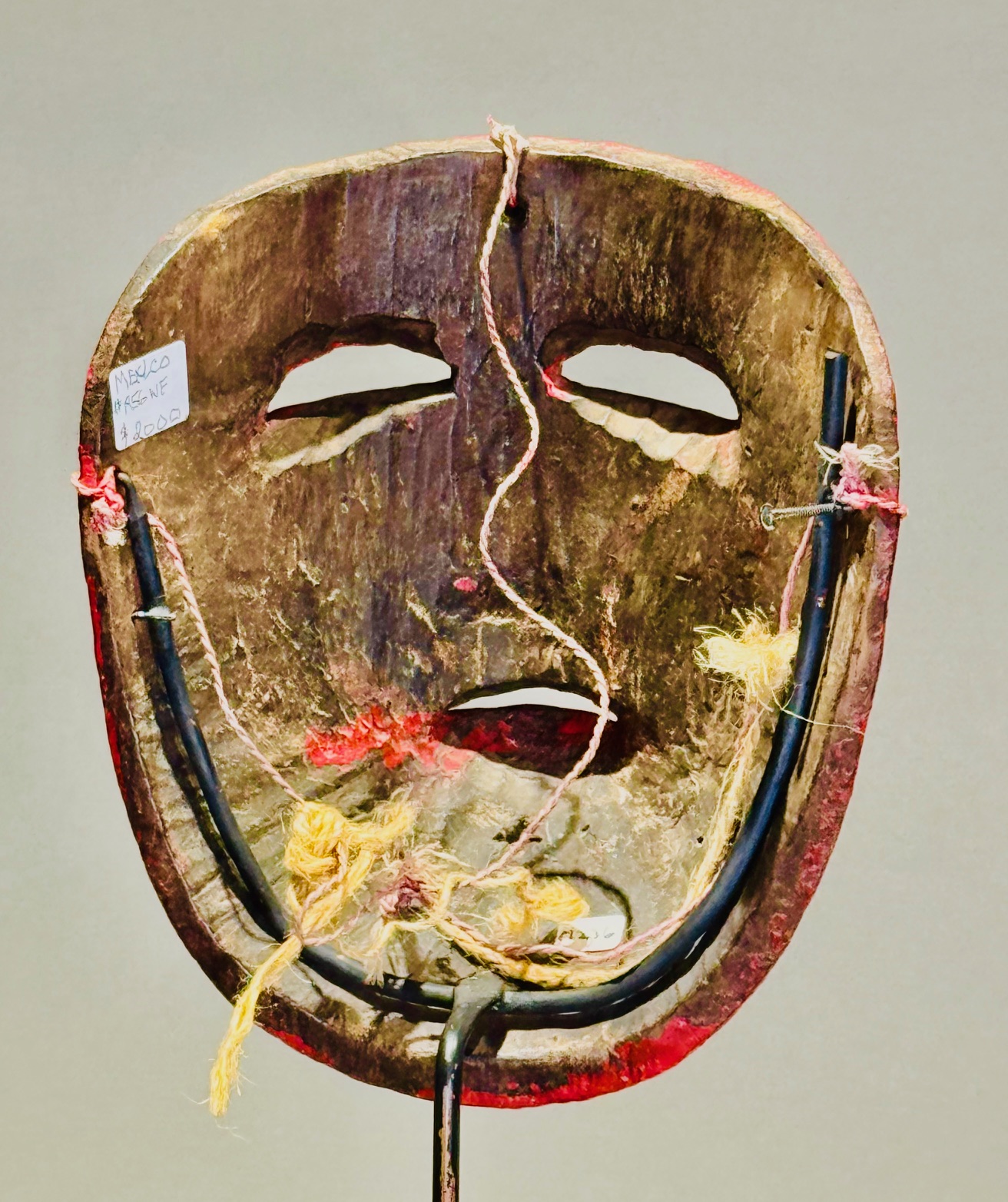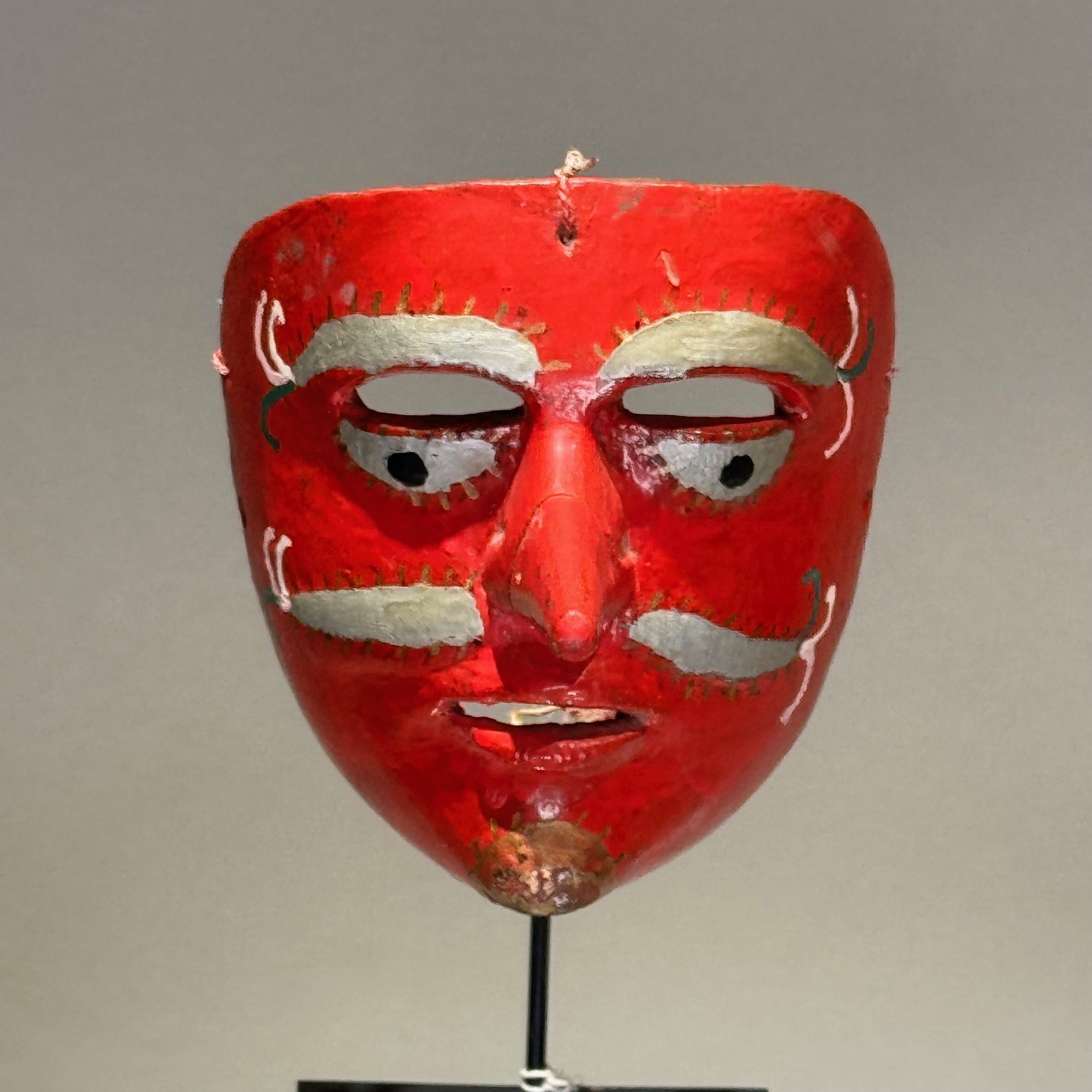Wood mask of a human face with a long "Cyrano" type nose; gold on chin, silver-painted eyes and moustache, and touches of green and white; on metal base