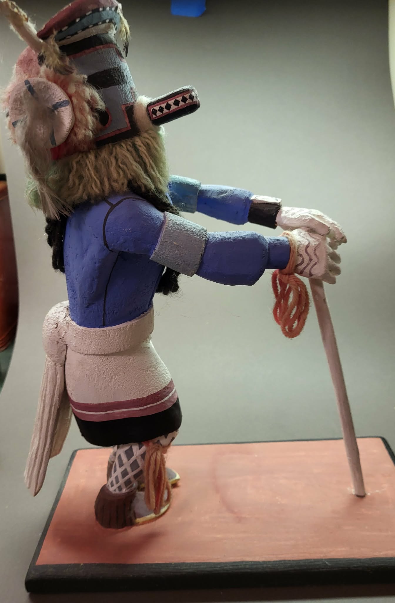 Colorful and detailed, this large katsina figure stands 14” to the top of his head. Includes vintage decorations of yarn, and stands on a painted base. Signed Lynn Albert with his corn-clan symbol. In very good condition, although the horns are worn.