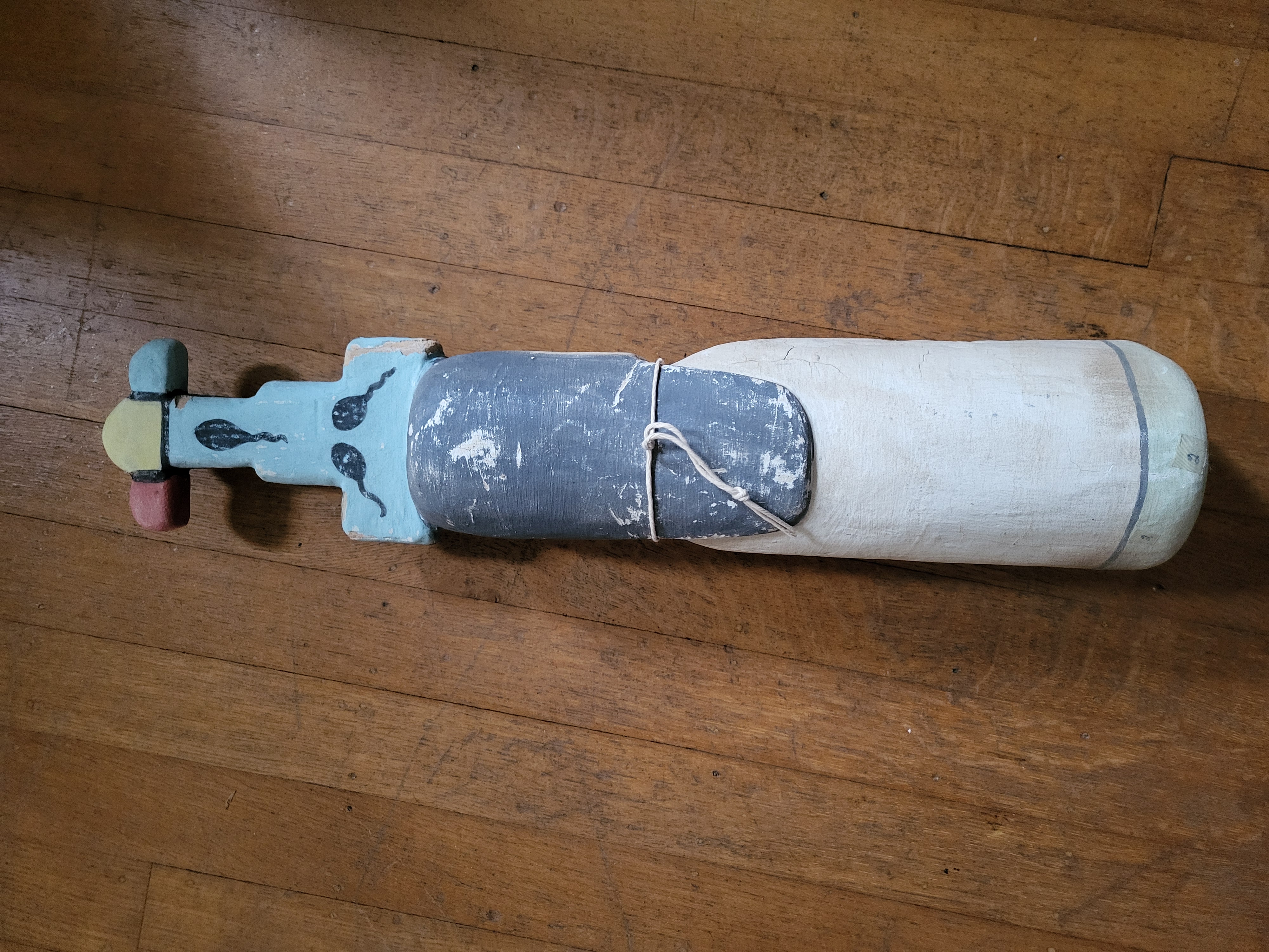 Wearing a tableta featuring cloud symbols and tadpoles, this peaceful-looking being is not a katsina, but seems to symbolize the life-giving force of water. Stands 18" high.