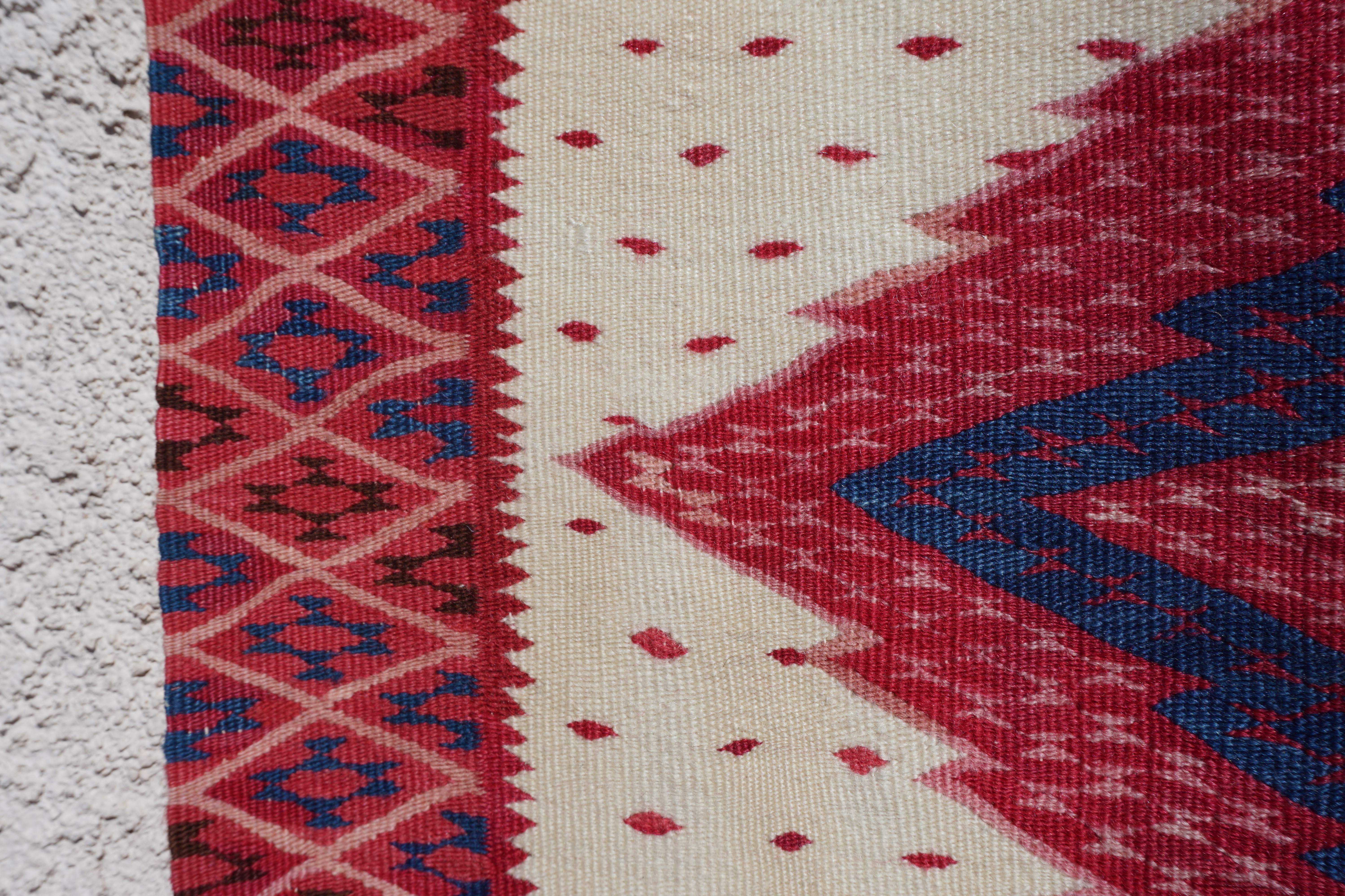This sarape is from the Classic Period, ca: 1775-1810. It is woven using finely spun Merino wool weft on 2 ply handspun cotton warp. The rich red and blue colors are from cochineal and indigo dyes.