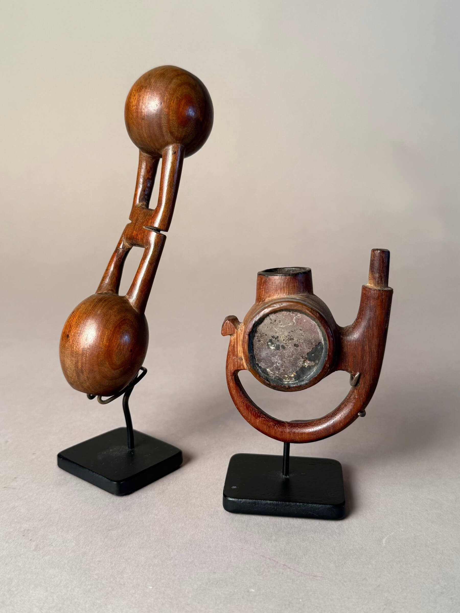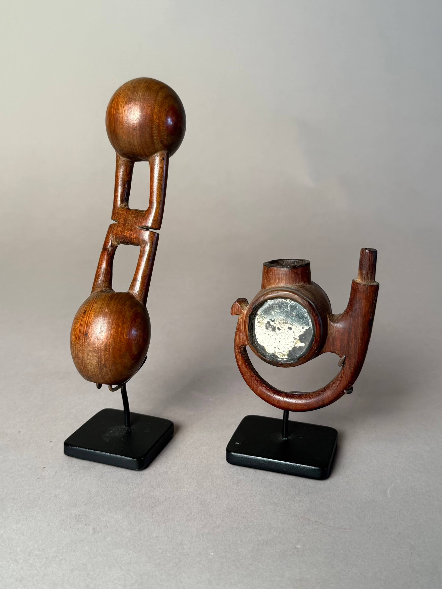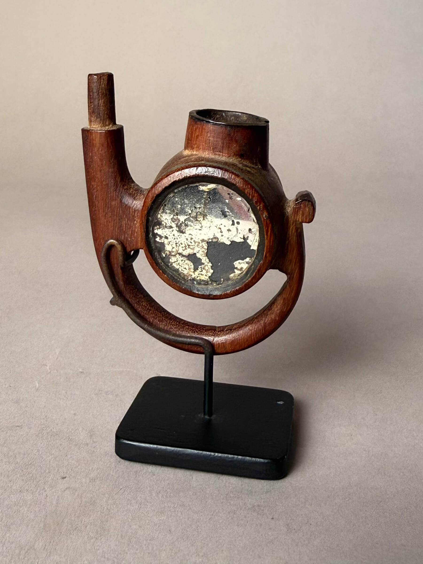 Right: Late 19th century Pipe with two mirrors, probably Cape Nguni people. An unusual form-I have not seen another of this type. $900 3"h x 2.5" w