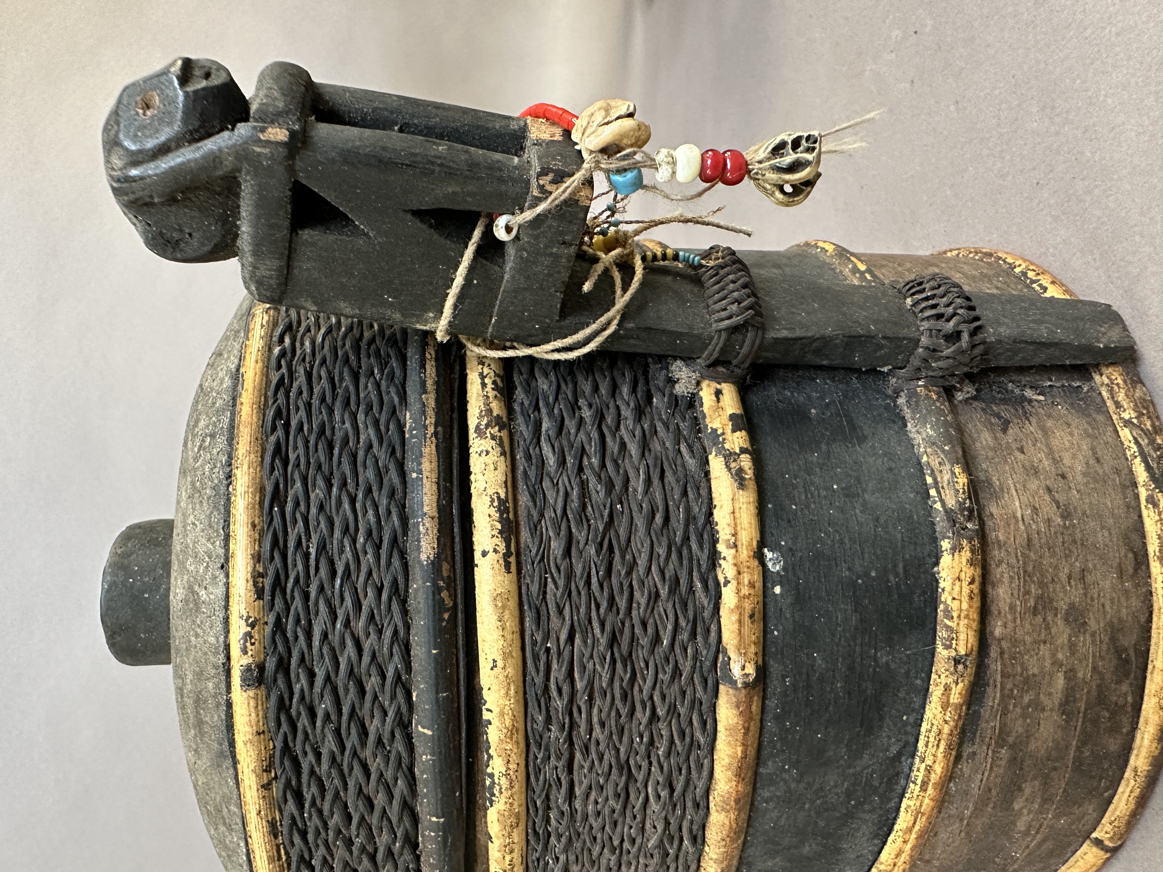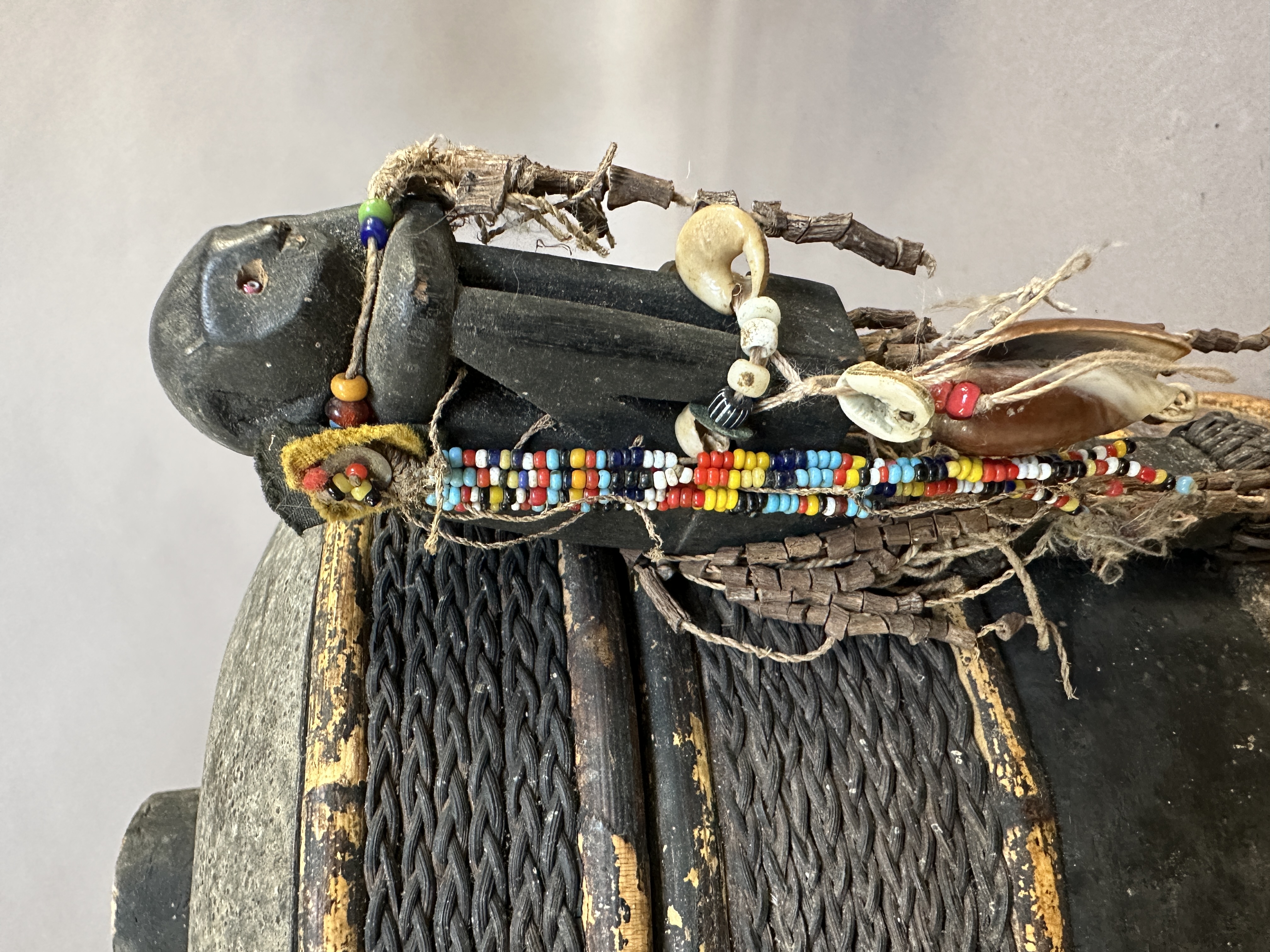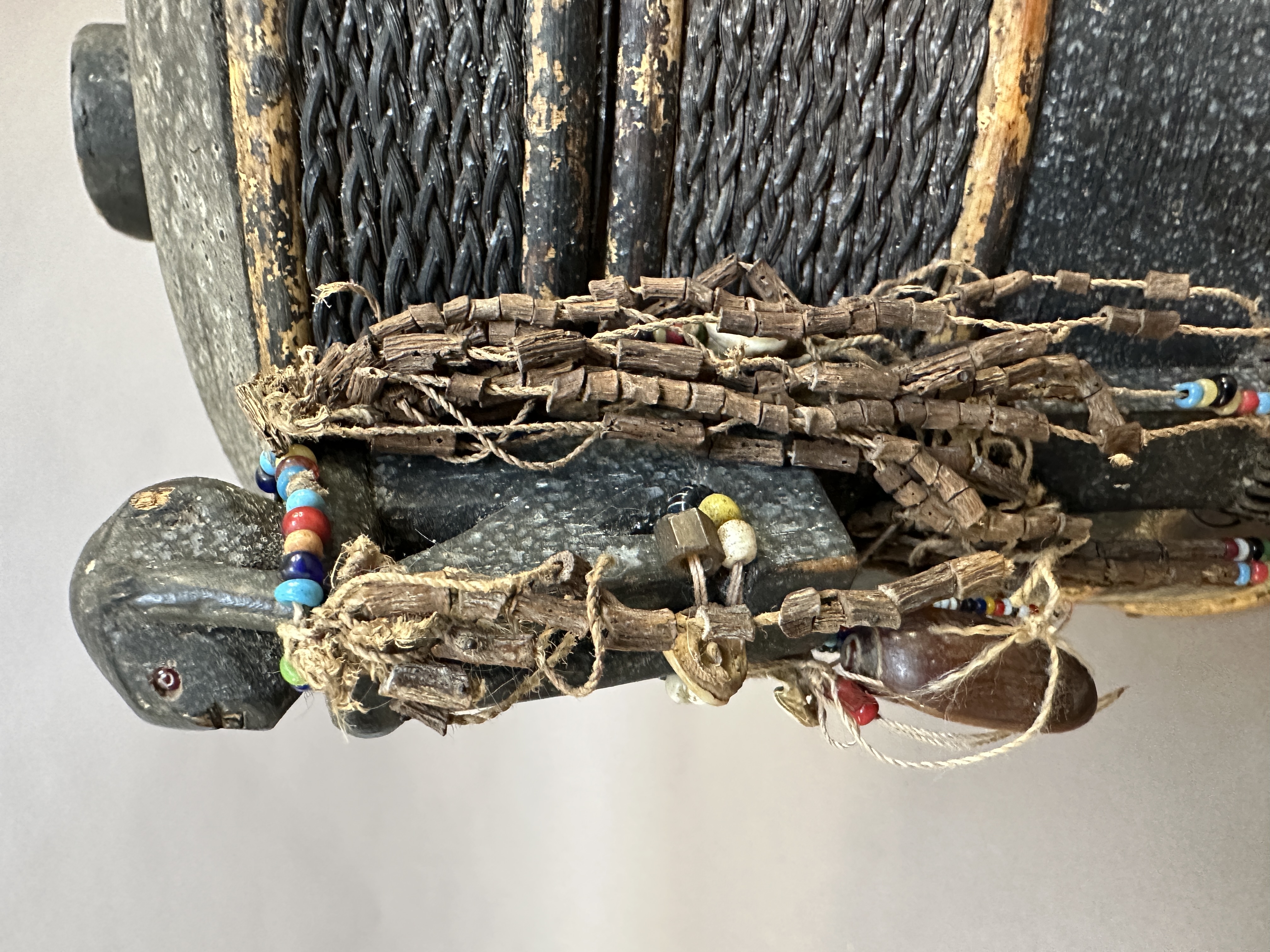 Shaman's box or 'lupong'. Dayak Iban, West Kalimantan. Bark, wood, ratan, glass beads. Early 20th century. Indonesian art-market.