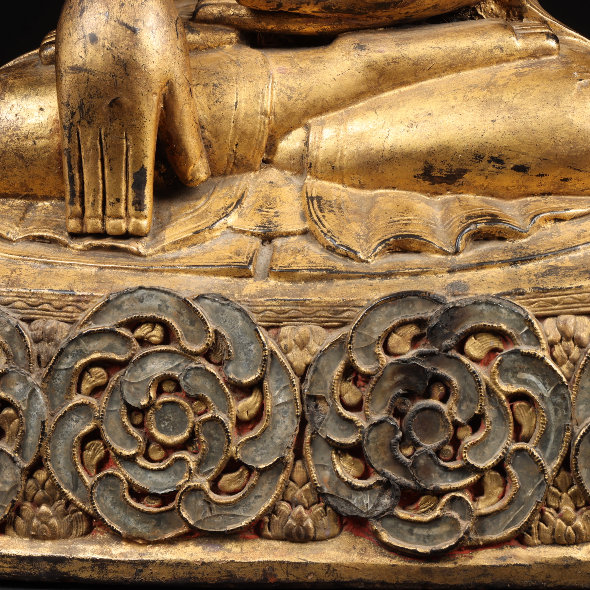 A beautiful and peaceful large Burmese sitting Buddha. Carved from wood and covered with black and gold lacquer. The intricate glass flowers at the base are also set in with lacquer. Fine condition with some very small losses to the glass and no restoration.