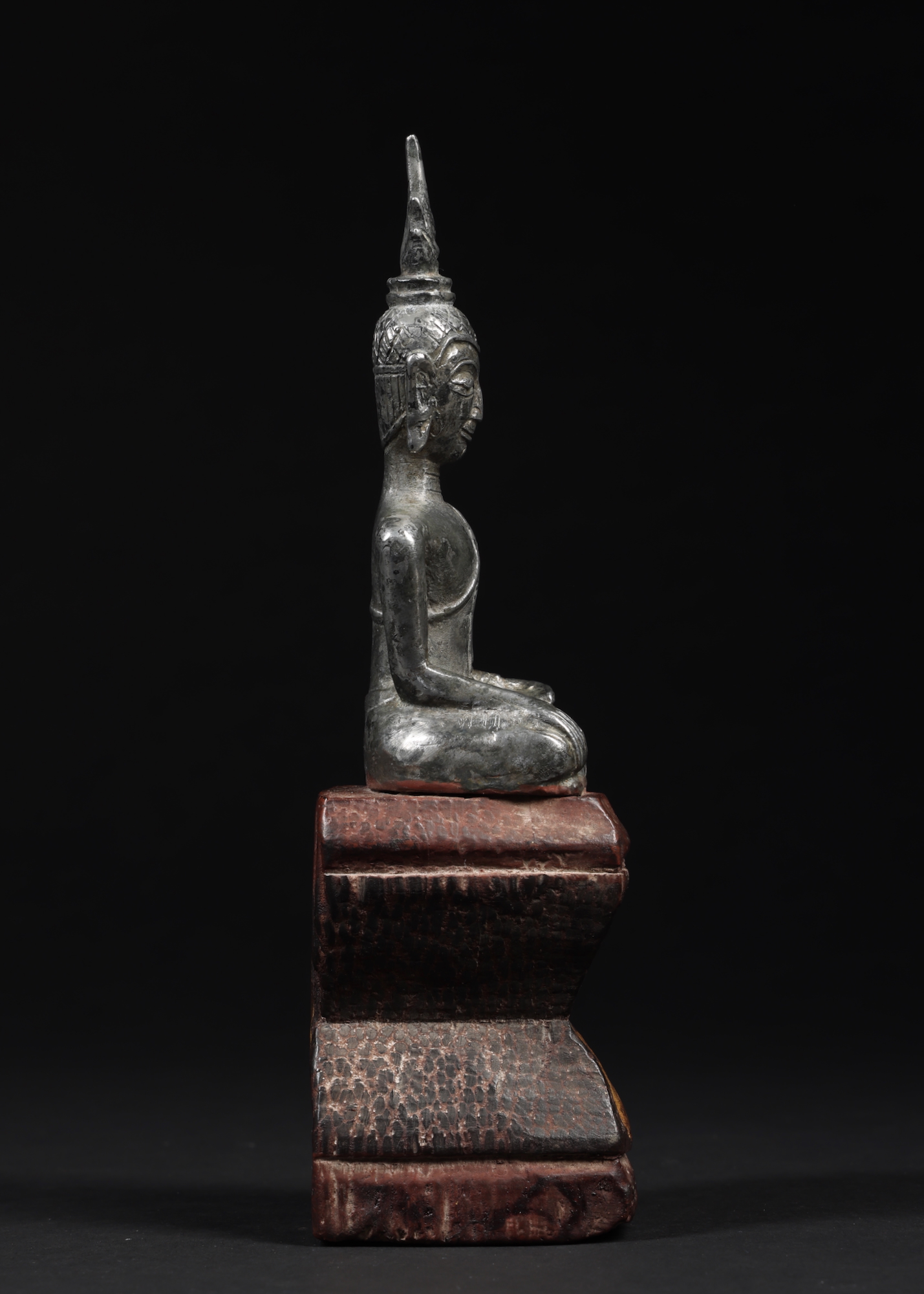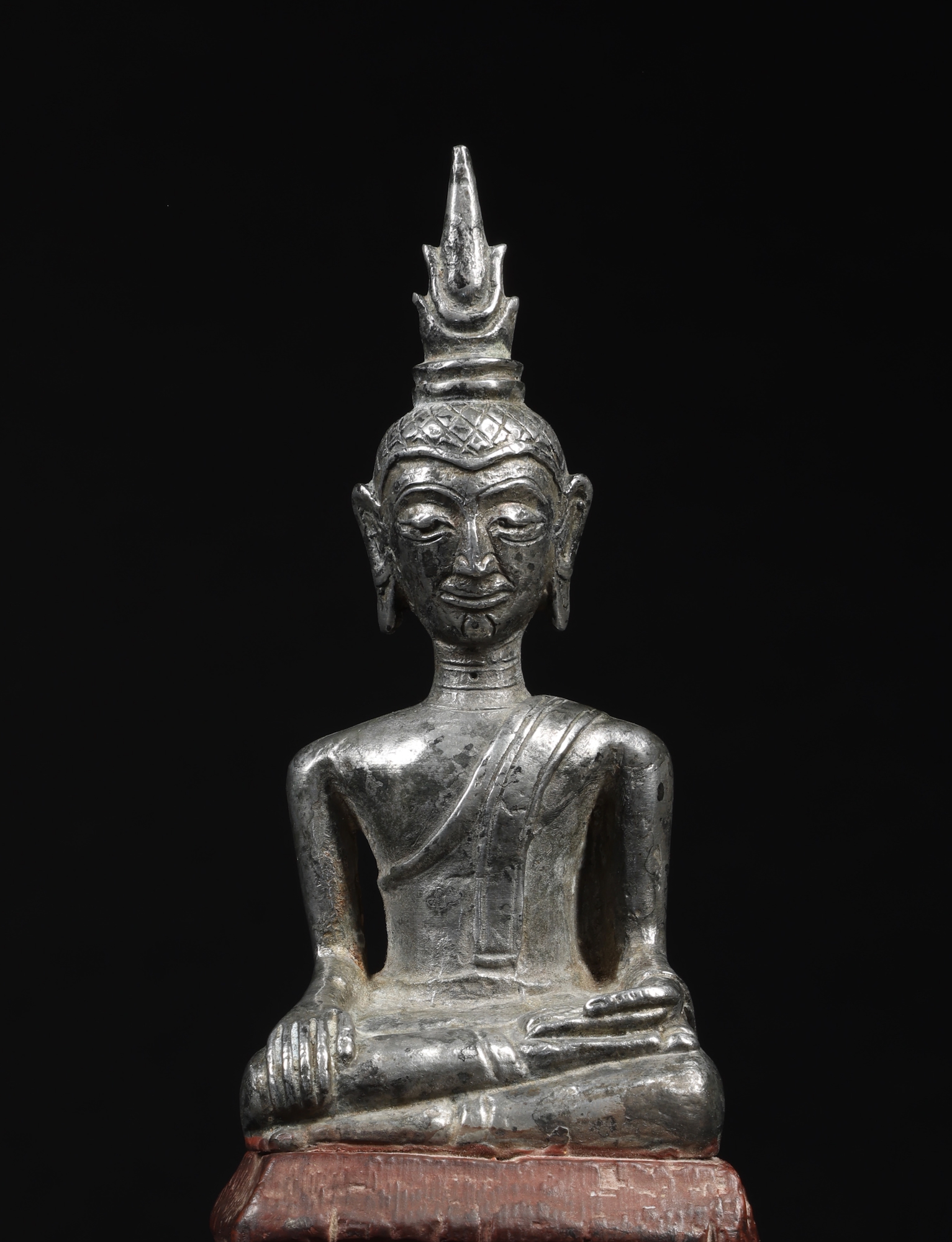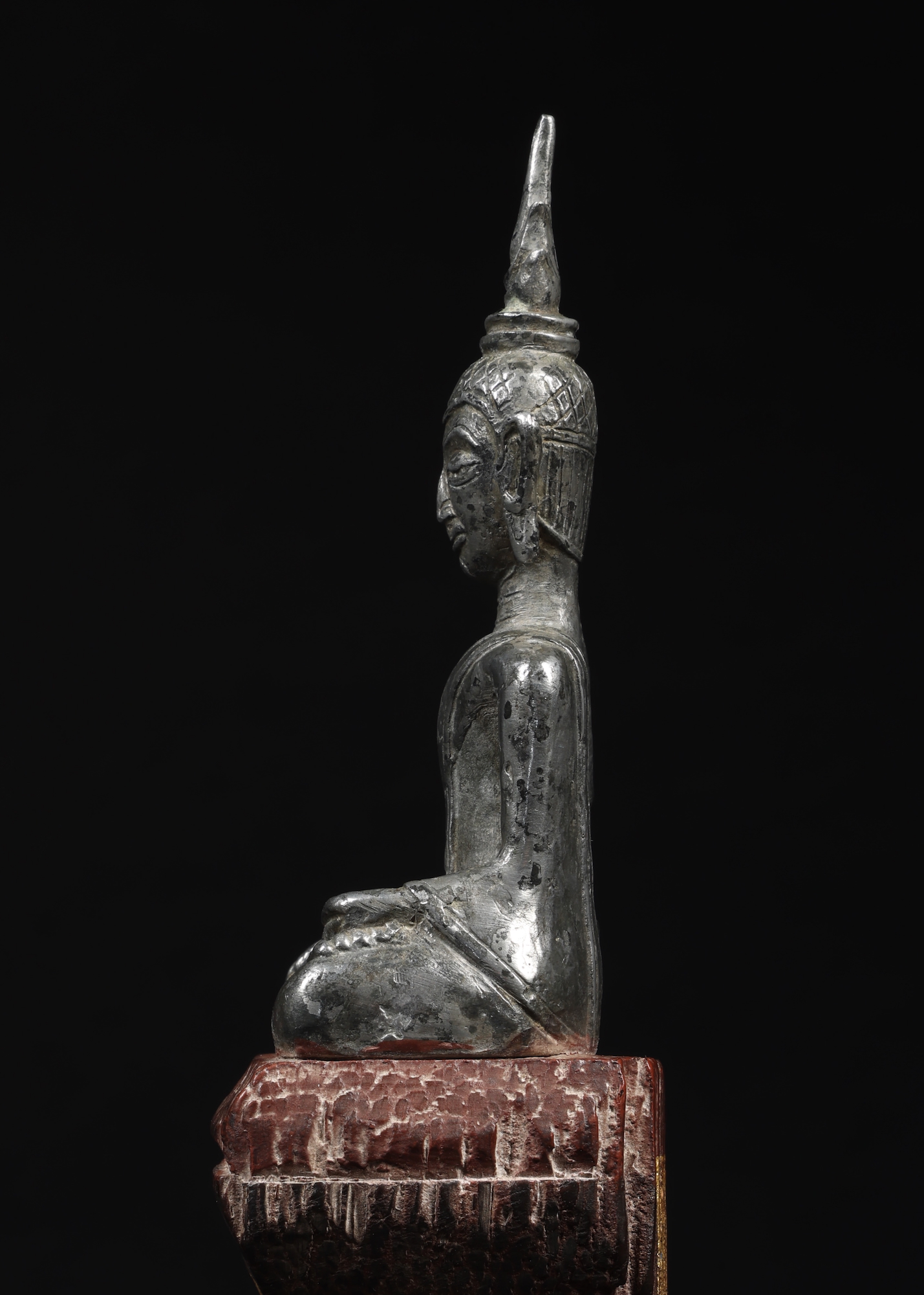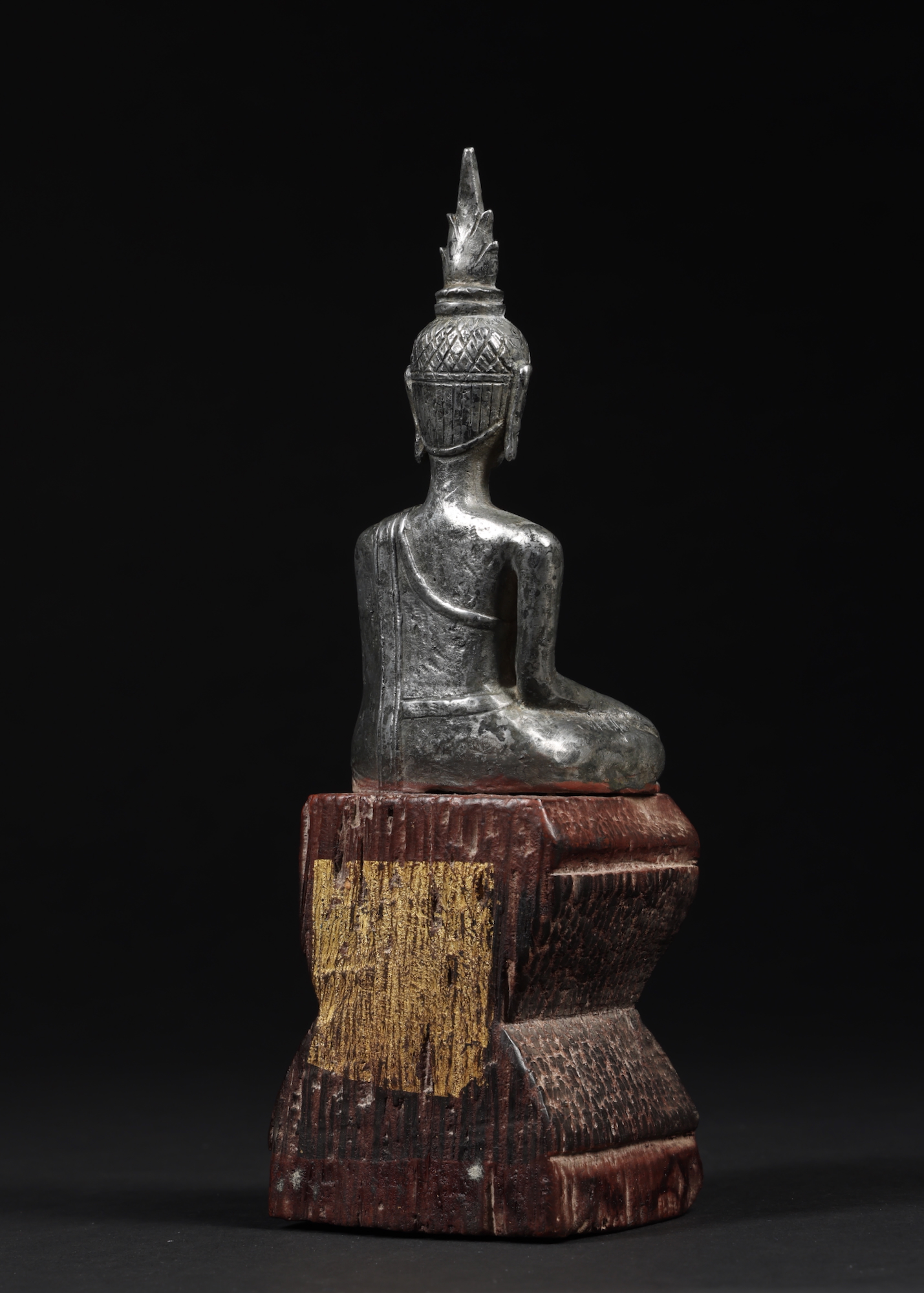 Silver Lanna style Buddha from Northern Thailand. The silver is quite thick, or possibly the top half is solid as it is quite heavy. The figure is attached to the old wood block that has some gold ceremonial foil.