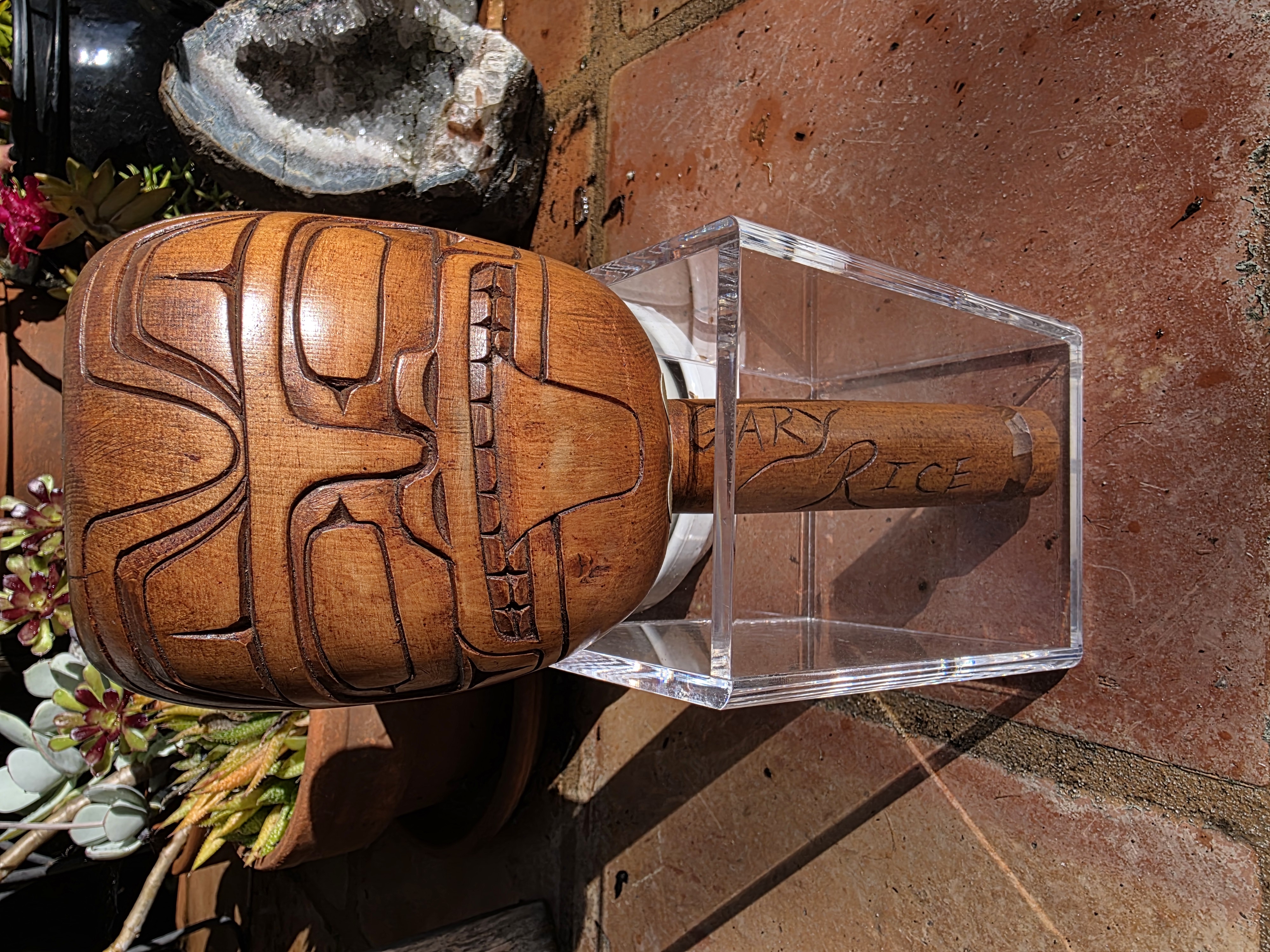 Superbly carved Eagle rattle by Gary Rice (1935- ?) - Kwakiutl. The balace, the sound and the skilled woodwork makes this rattle a powerful piece of artwork. This rattle feels like "deep medicine", and although made "for sale", it has presence and meaning.
