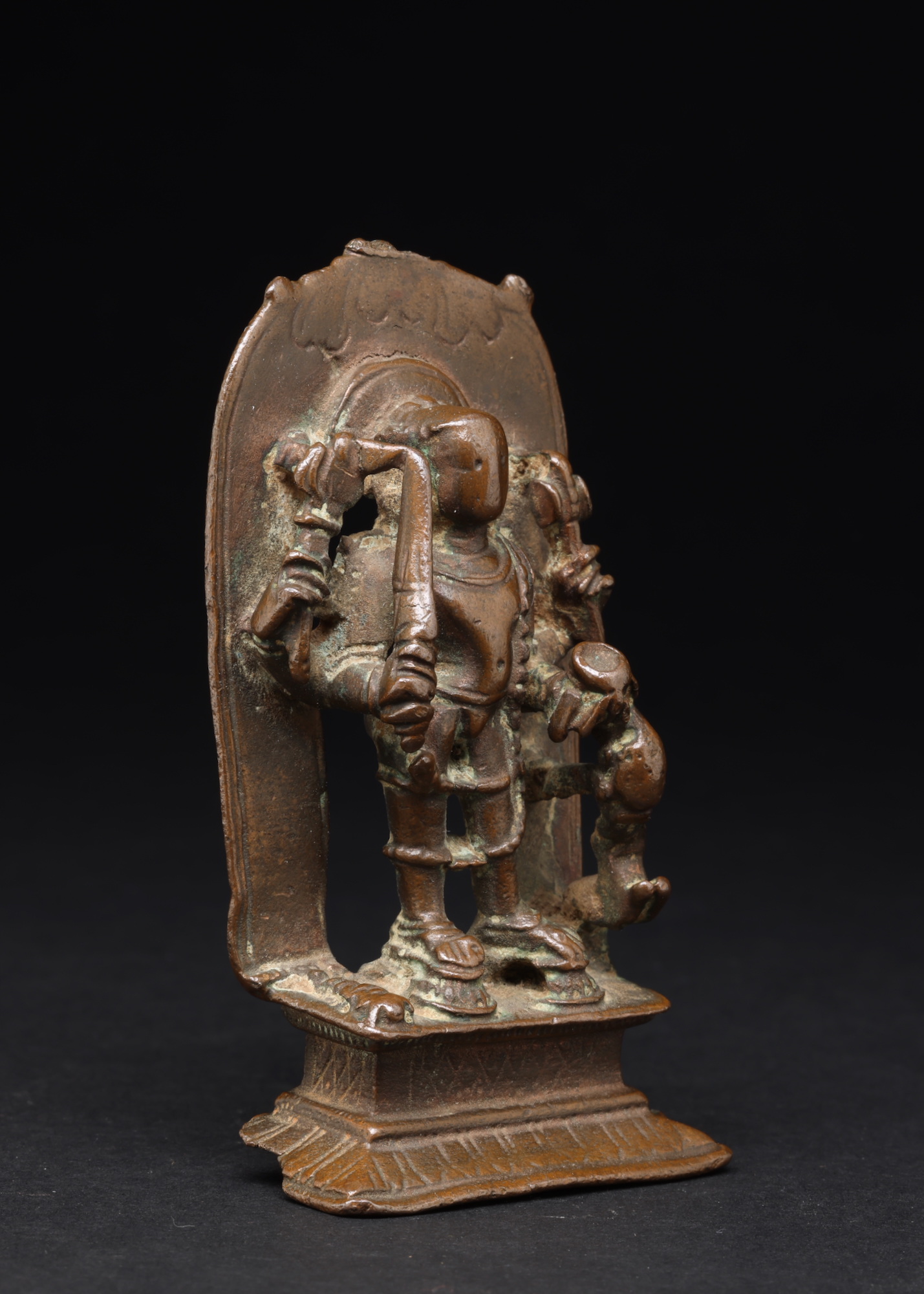 Shiva Bhairava is the fierce wrathful manifestation of Lord Shiva associated with destruction which is necessary for renewal, and also for protection.  He holds a severed head in one hand with his sacred vehicle dog biting at it. A powerful very old and worn bronze with a lot of use.