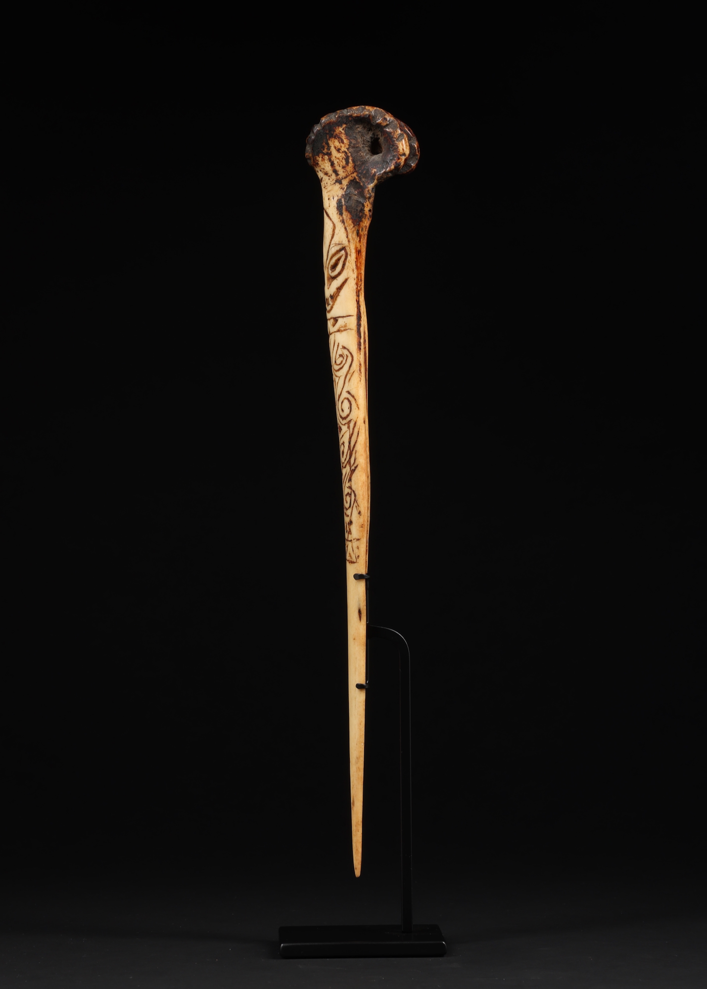 A good old cassowary bone dagger with a bat head image on the front. Very well carved with a deep rich patina from age and use. Mounted on a custom metal base.