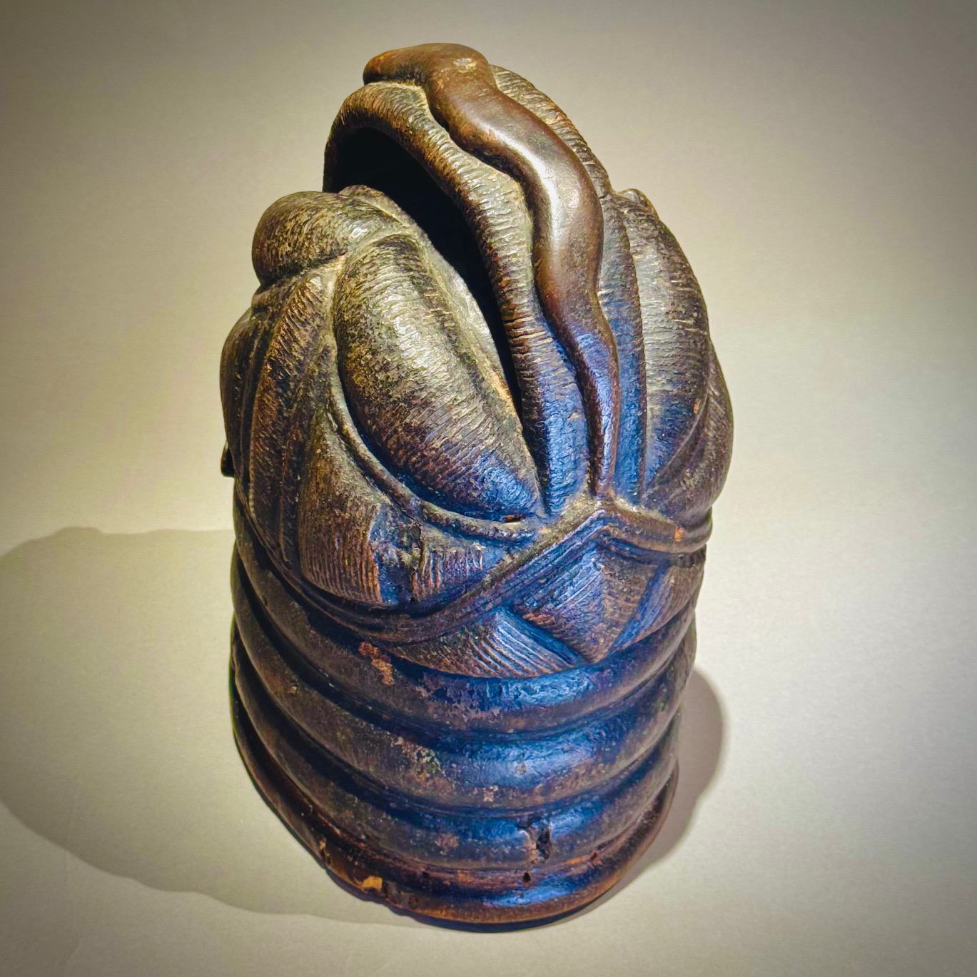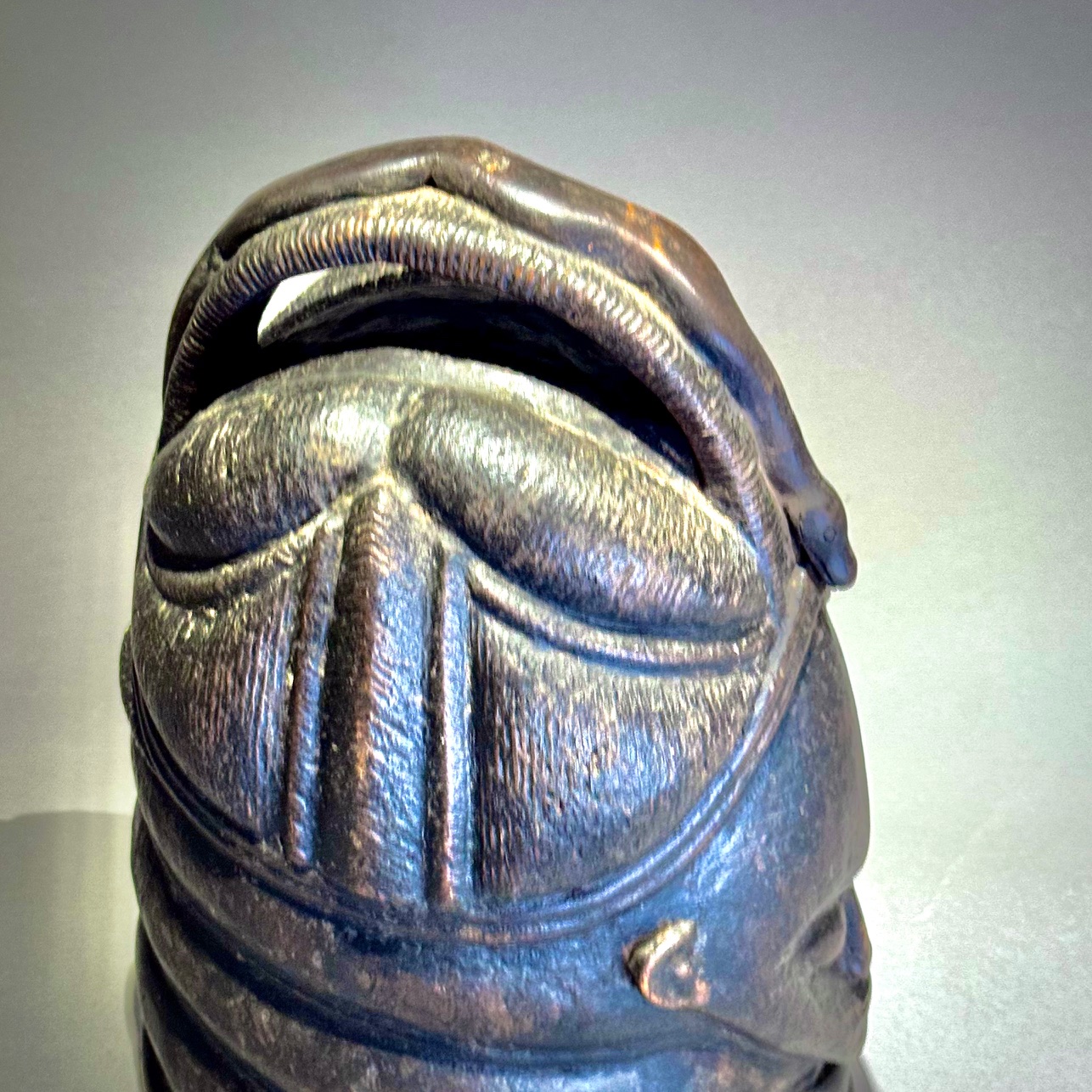 Helmet mask used in women's secret Sande Society; dark treated wood with traditional triangular face; snake carved atop