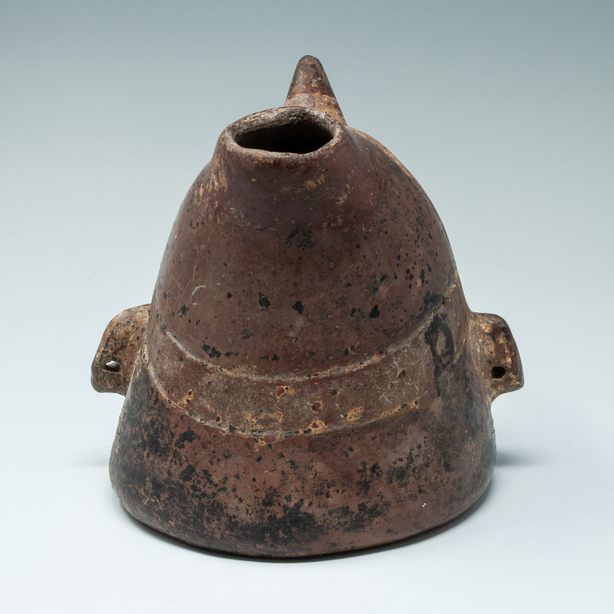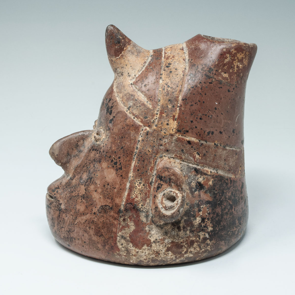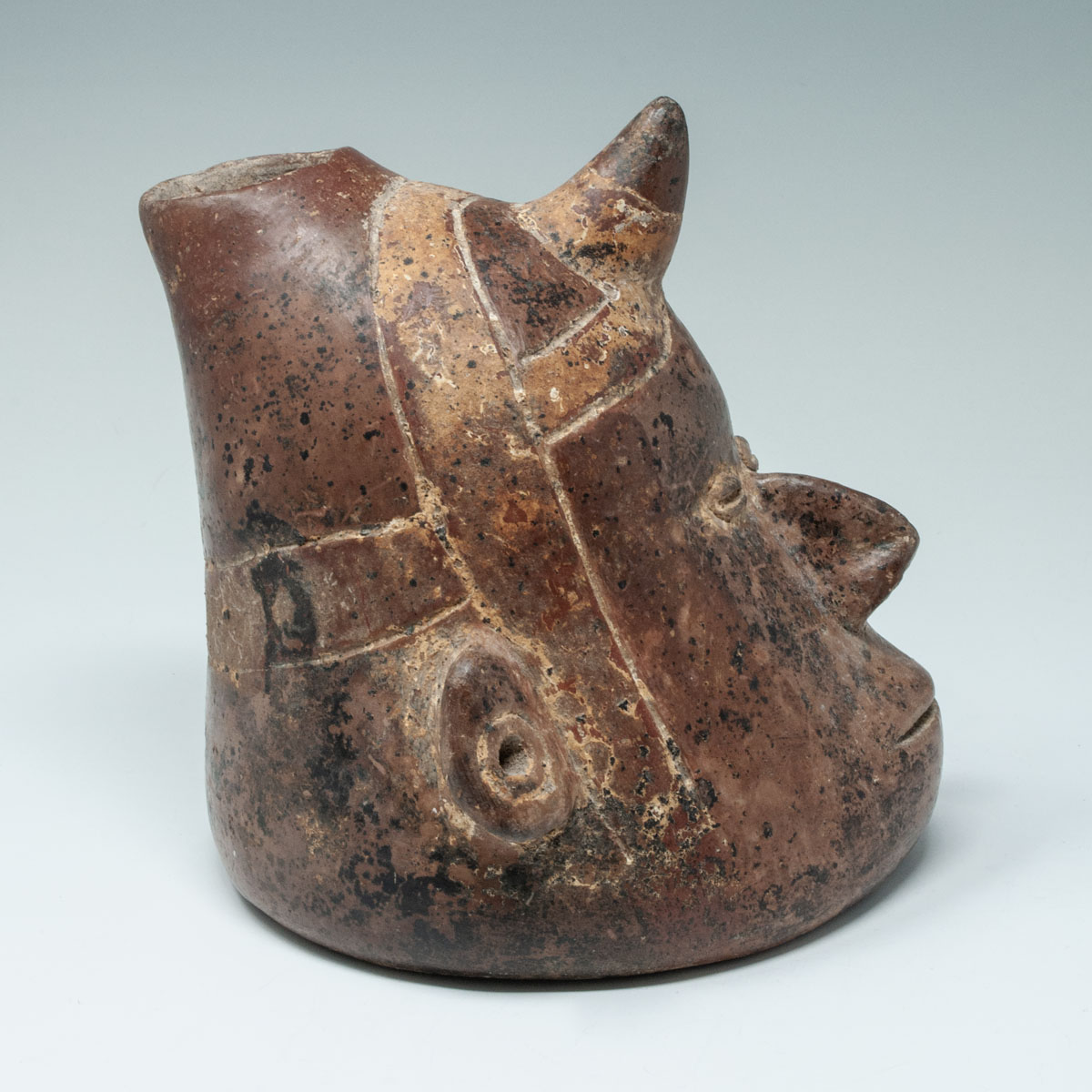 A classic shaman's head vessel having a horn strapped onto the forehead with a slip-painted headband, coffee bean eyes, sharp nose and slit mouth. The ears are pierced and there are nice mineral deposits overall.
