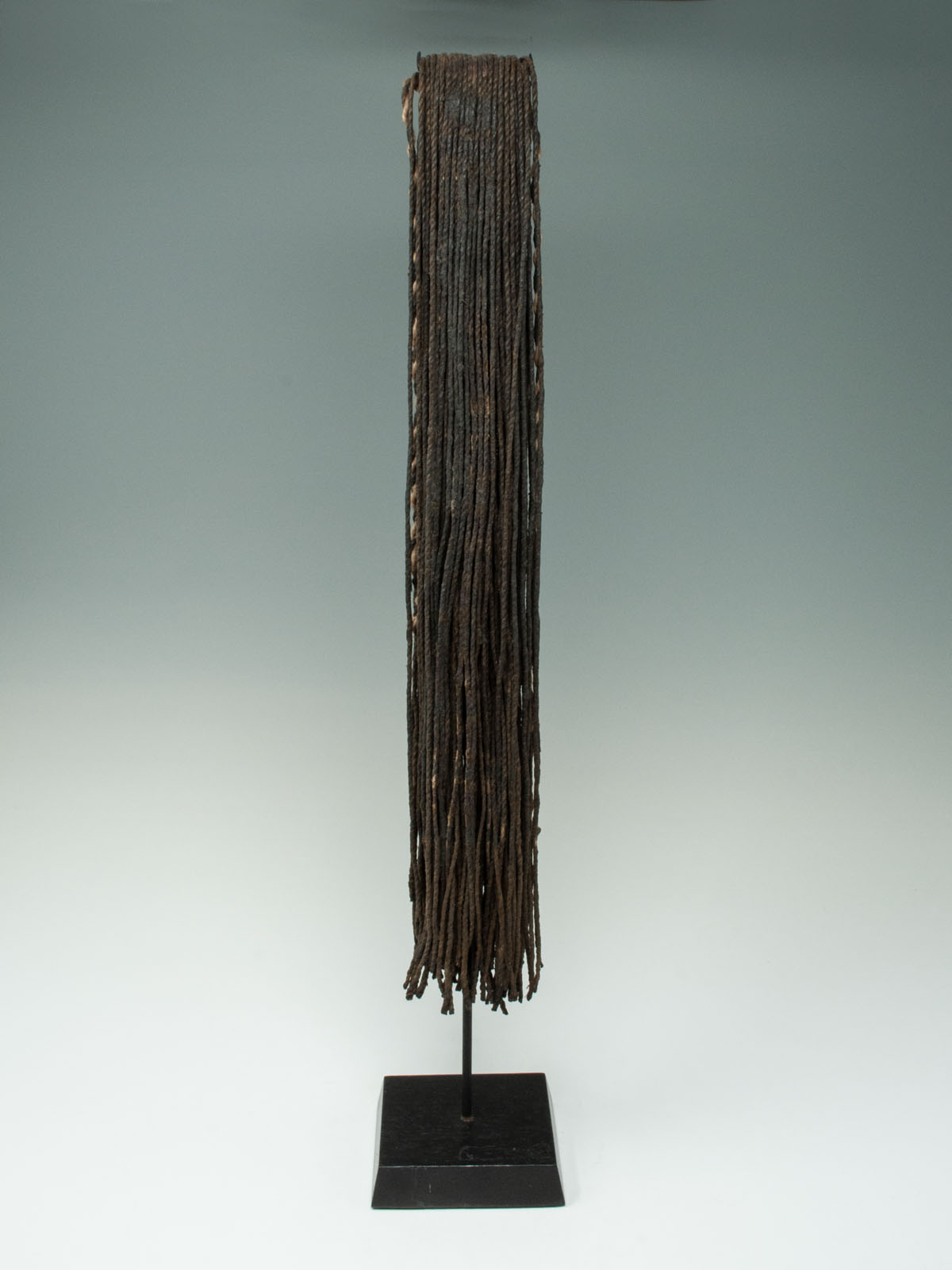 An unusual narrow cache-sexe from the Kirdi tribe of Cameroon is made of glass beads, fiber string and cowrie shells. It stands 18 inches high and would have been worn around the waist as a modesty garment. Custom base included.