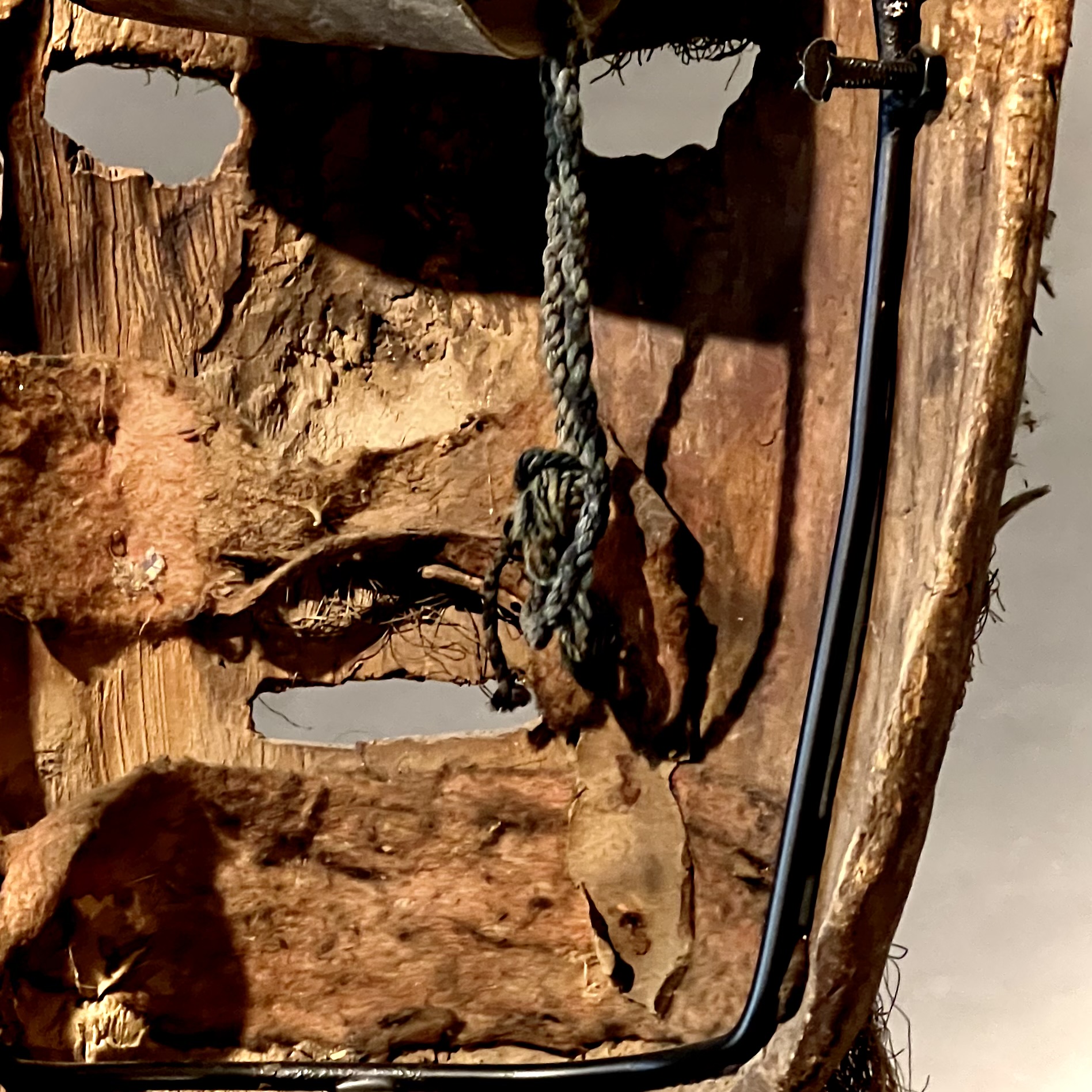 Natural unpainted mask of man with beard, other attachments made of hemp, animal hide.
