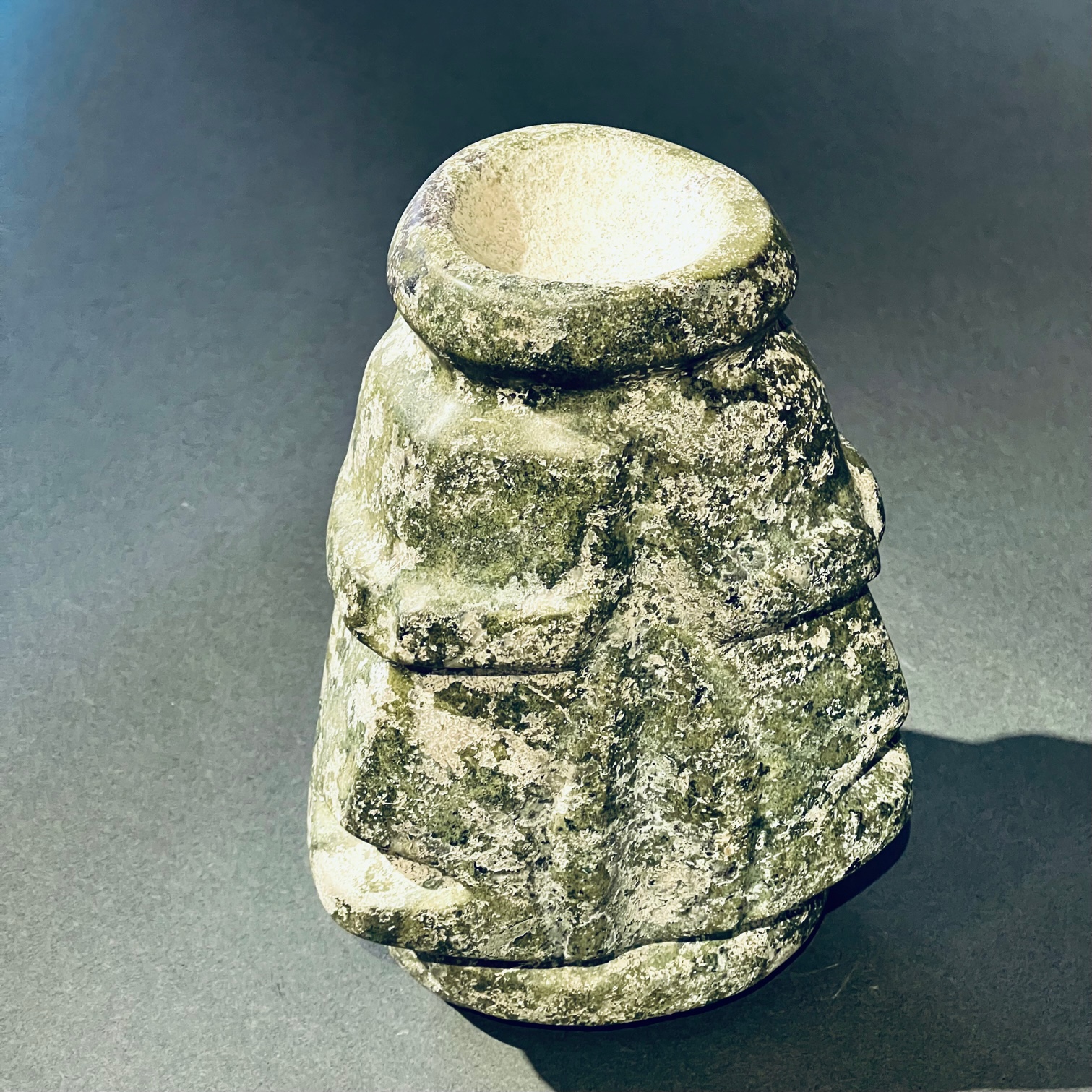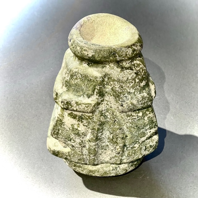 A fantastical stone metate or mortar, carved into a standing ANTHROPOmorph with heads projecting out at three equilateral triangular faces on three sides. The basin on top is shallow and worn from use to grind or pulverize plant matter or other substances. The effort put into shaping a simple vessel/tool into a dramatic artful, powerful effigy indicates ritualistic use, perhaps grinding hallucinogens for a ceremony or pigments for annointment.