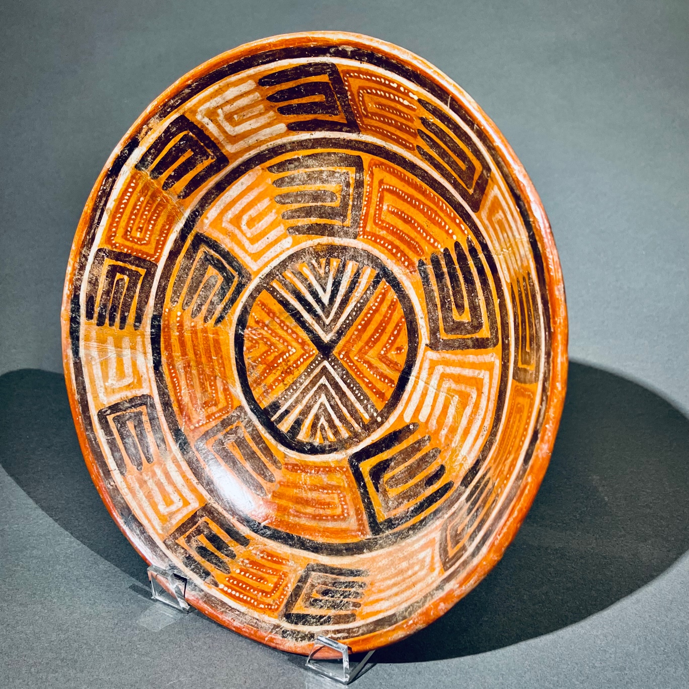 A large plate and a smaller bowl with similar polychrome designs in black, orange and cream. If purchased separately, the larger is $1800, the smaller is $450. Dimensions of smaller are H 3.25"x D 7"