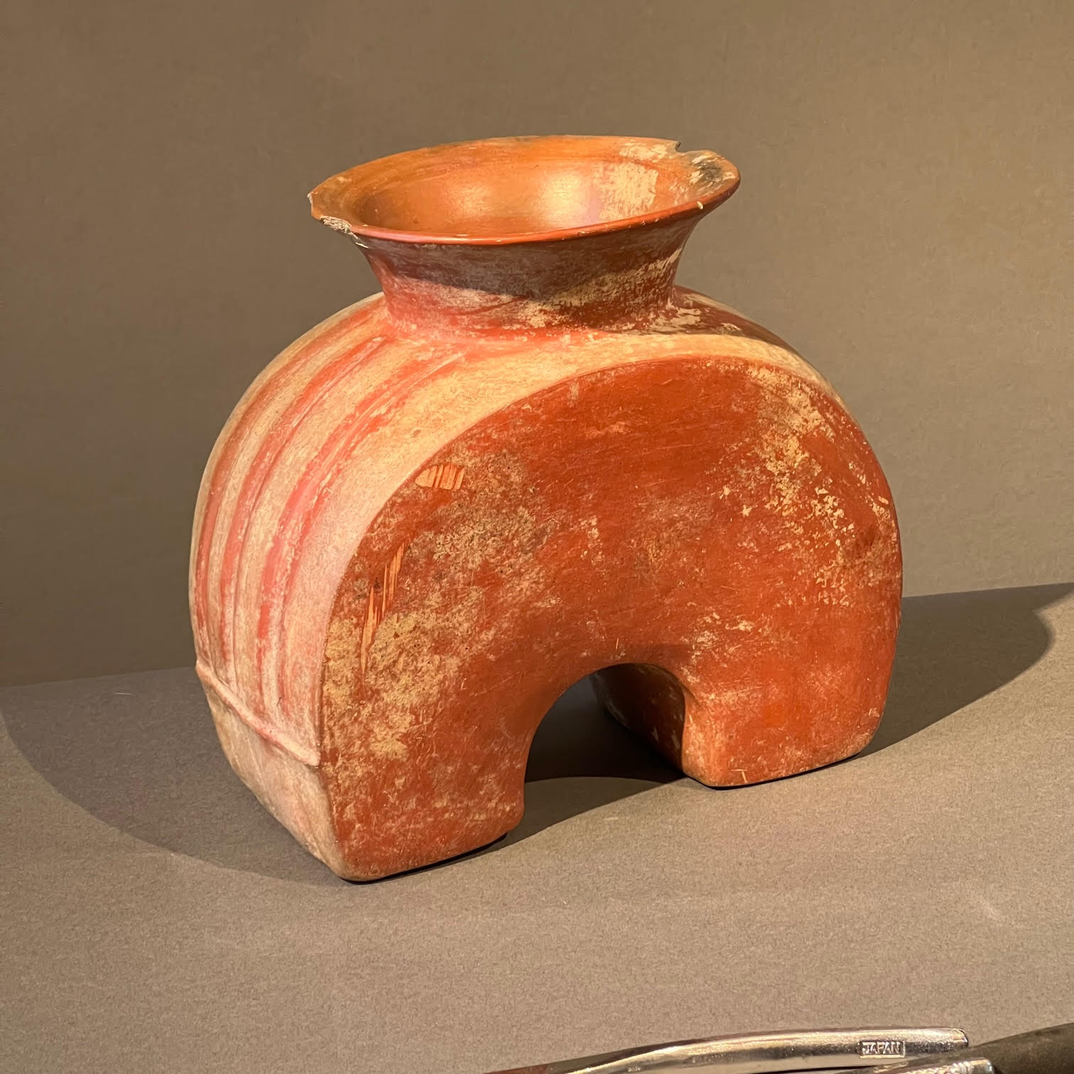 Unusual 2-legged arching vessel, ceramic red with gray stripes along sides.