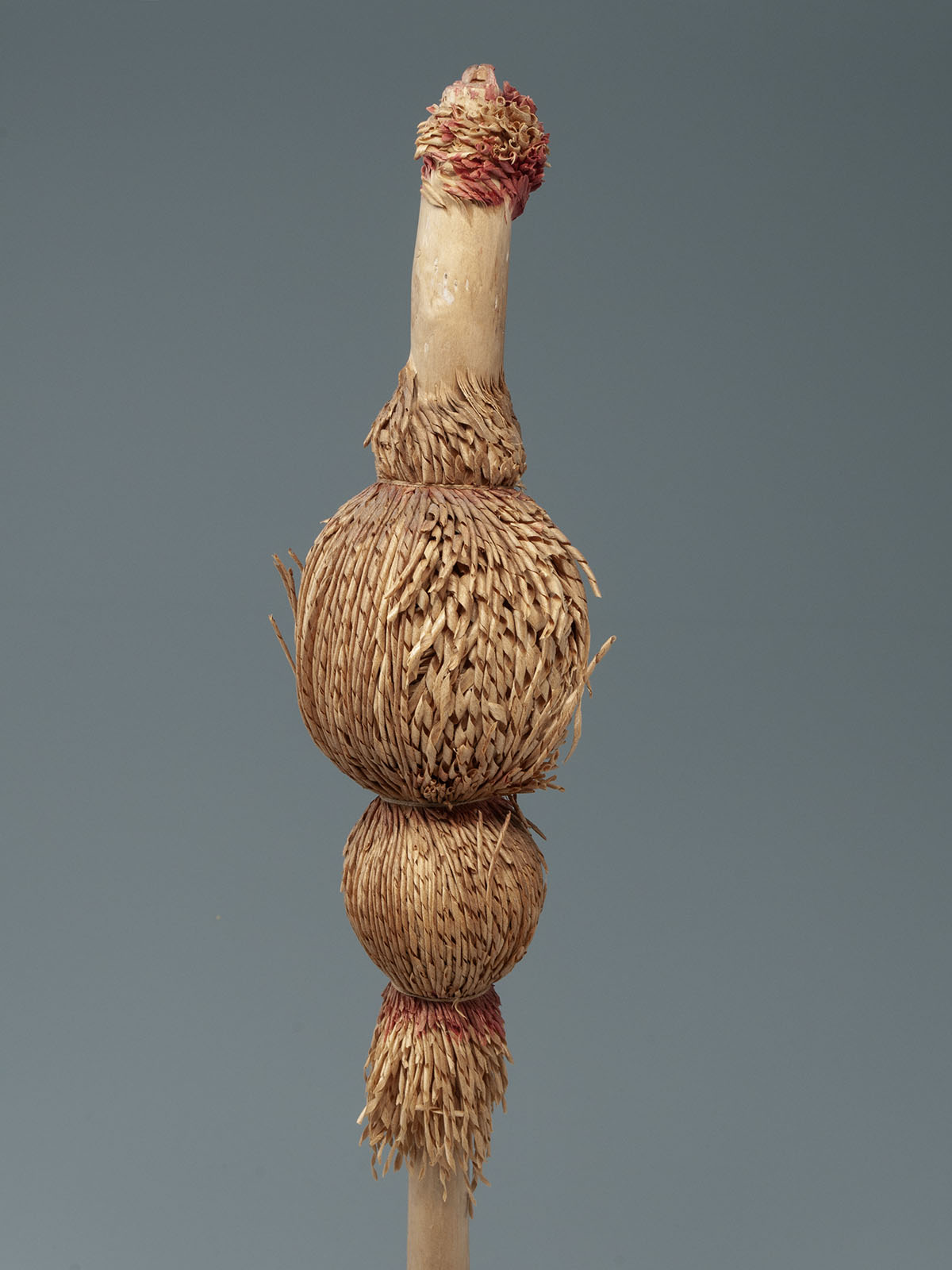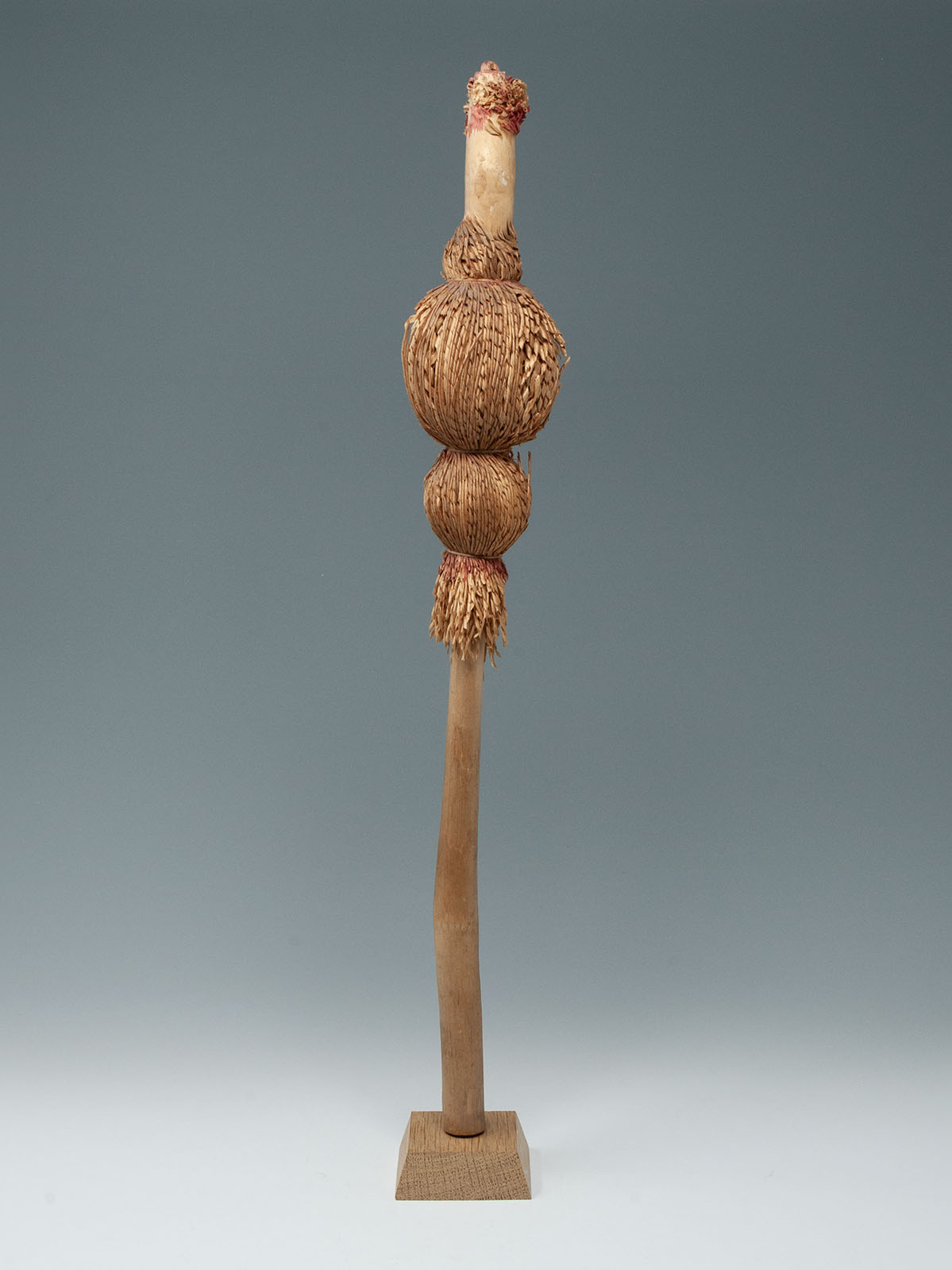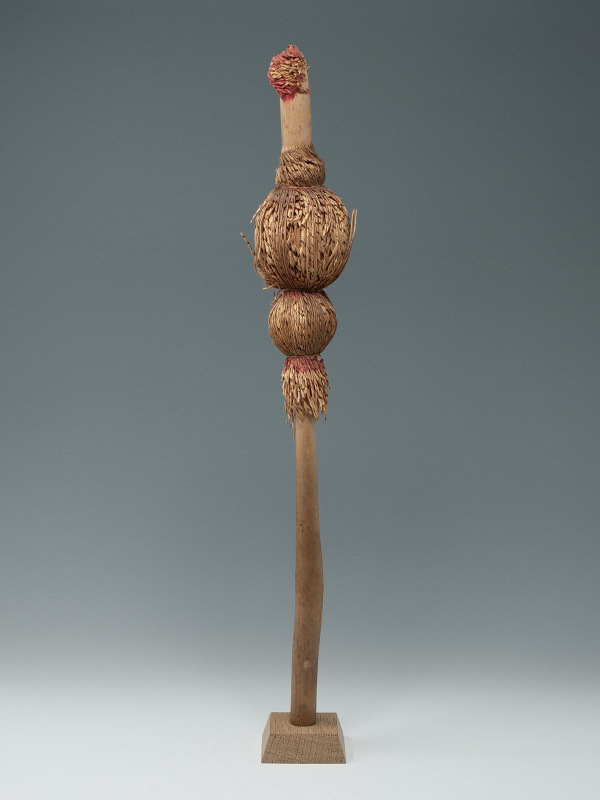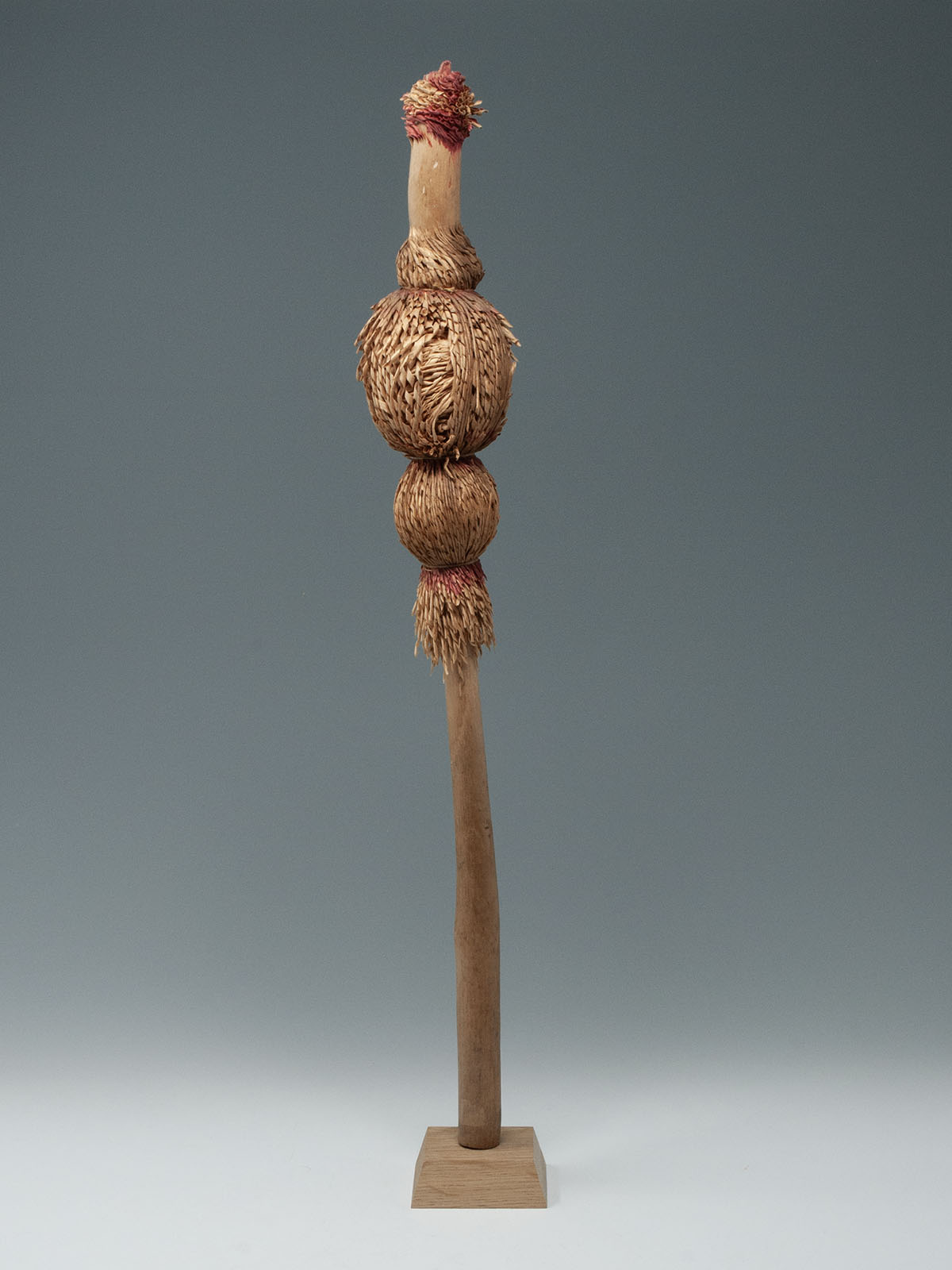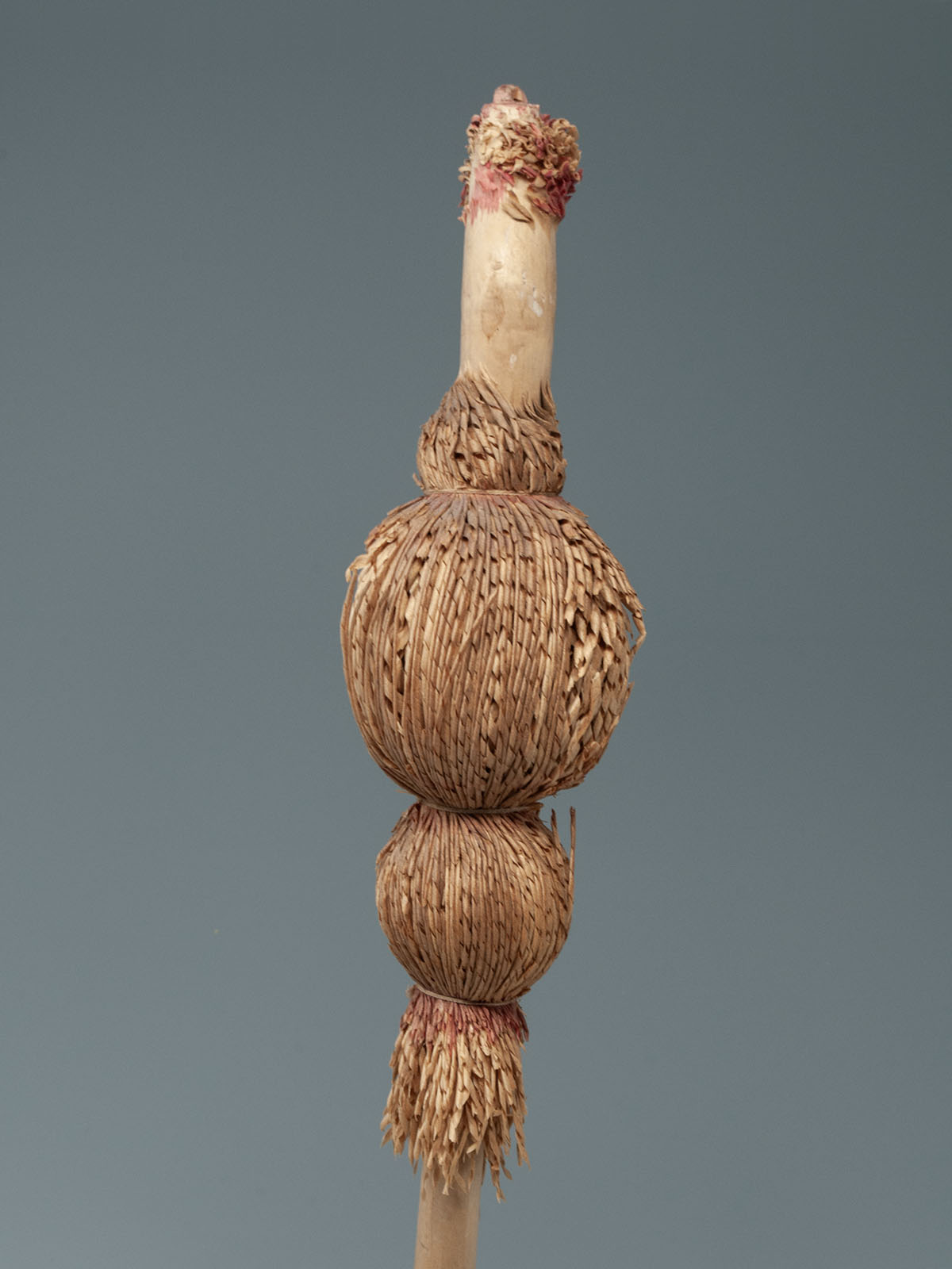 An unusual shaved willow wood inaw from the Ainu people of Hokkaido, Japan. Inaw of various shapes represented birds, which were believed to carry prayers to various gods; this bulb-shaped inaw is especially rare. The knowledge of which shapes were associated with which gods or for which particular purposes has been lost over time. First half 20th century.