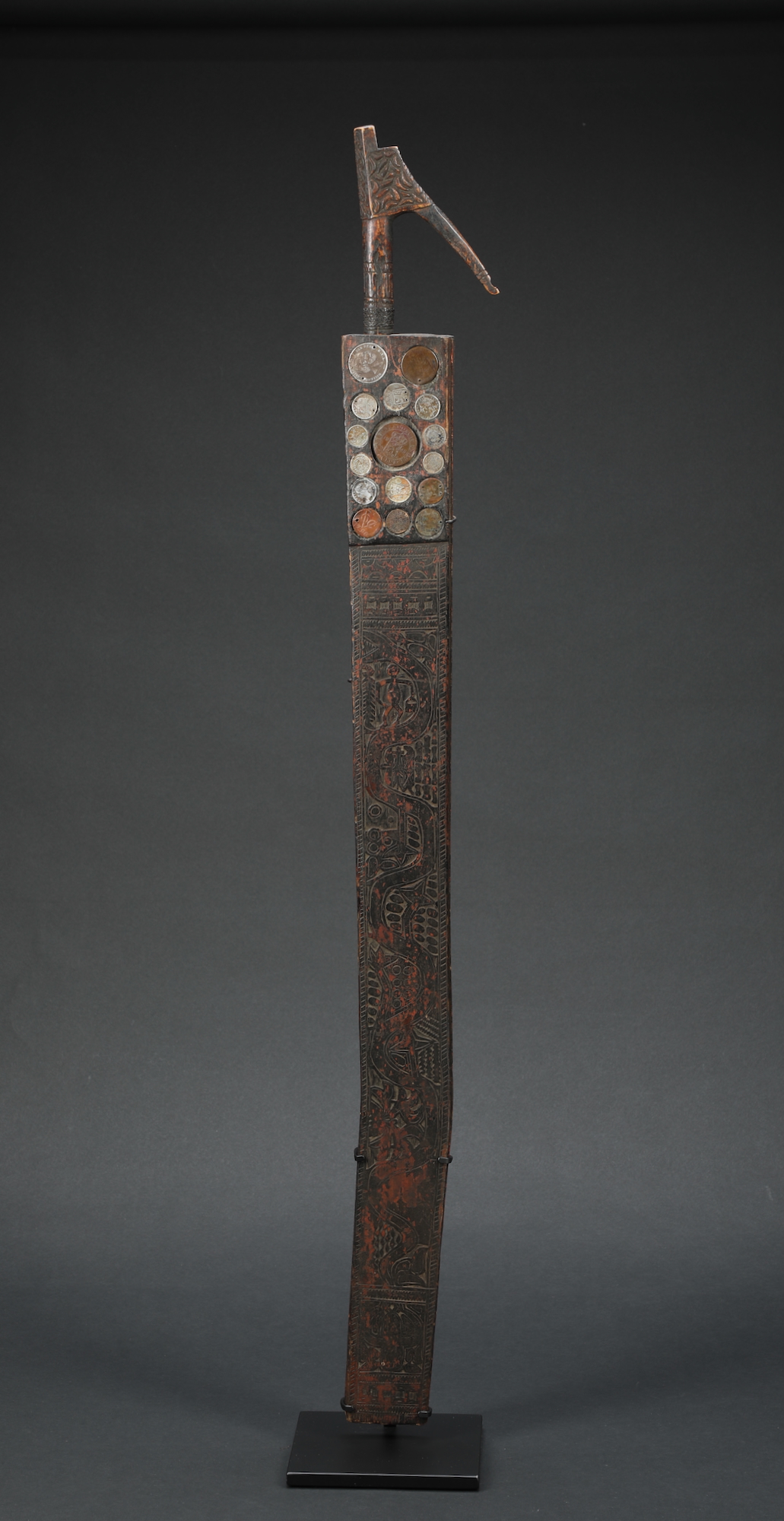 A rare and unusual Iban Dayak ceremonial sword. The deer antler handle is carved with leech and sprout tendril motifs. The long wood scabbard is carved with an intricate scene including a large serpent and person holding a basket (with a head?). The surface originally had a red natural pigment coloration, but it is largely covered over with a dark crusty black patina. The top of the scabbard is adorned with a variety of old coins from 1790 up until 1945. The odd shaped blade has a smaller blade attached, and dark surface as I have seen on other swords of this type. I have seen a handful of these swords, a couple published and have found very little information on who used them and how.