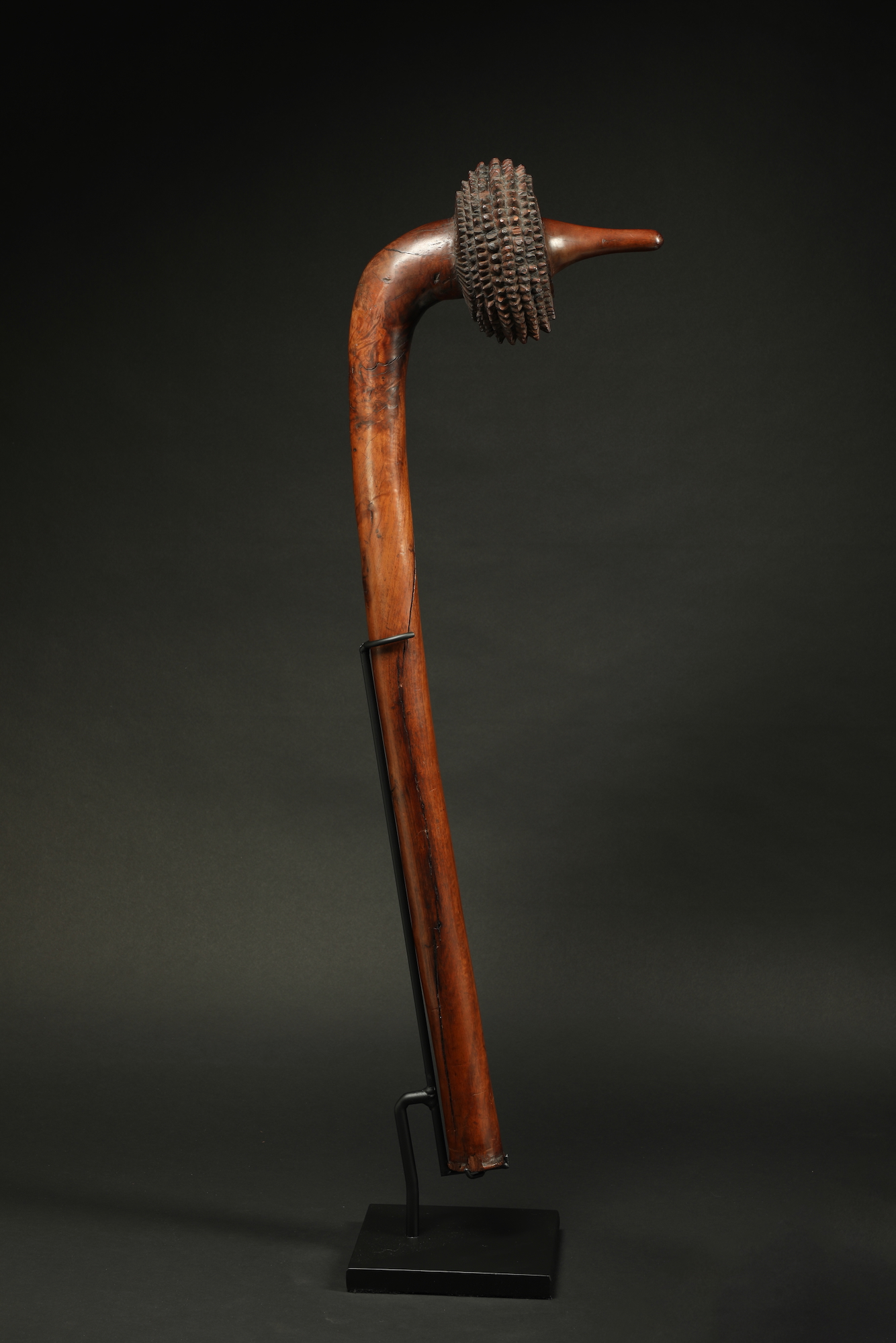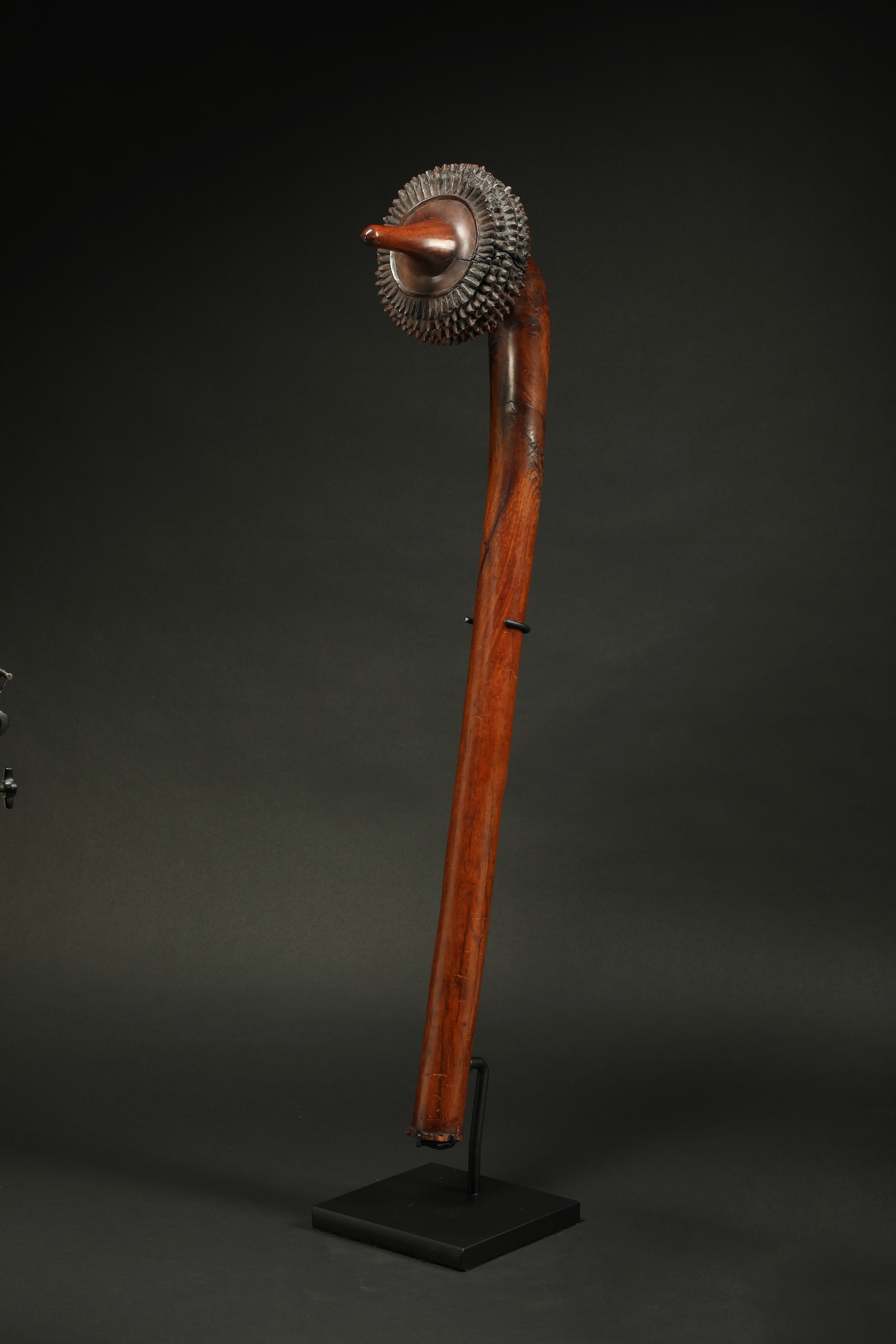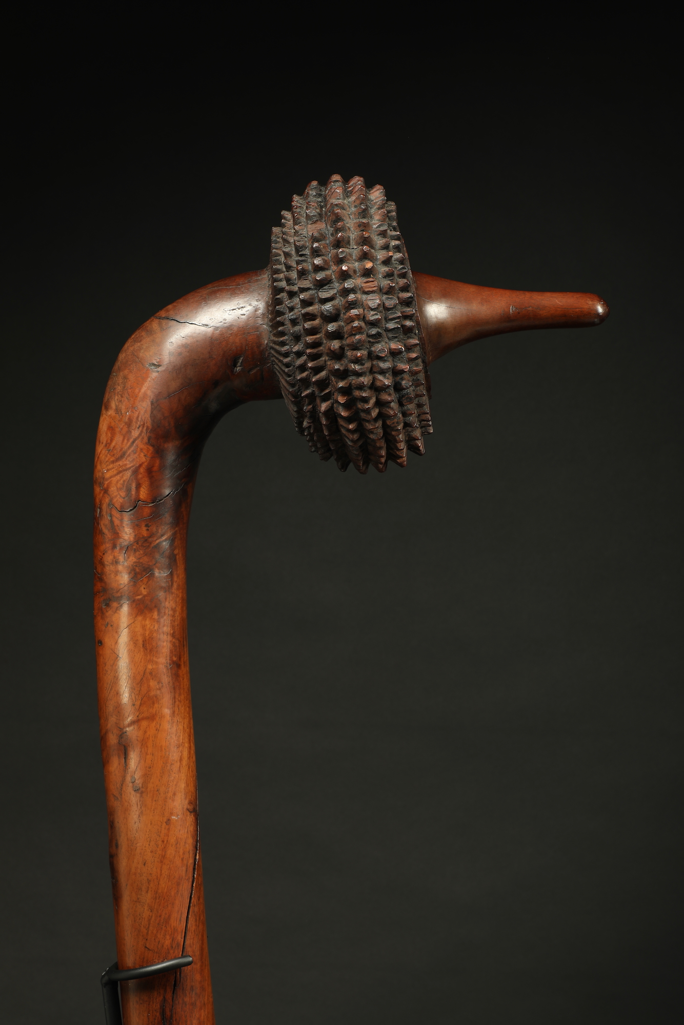 A fine and early Fijian Totokia war club with a large spiked head. The condition is quite good with minor spike losses and some stable cracks. The excellent patina is dark and glossy form age and use. Mounted on a custom metal stand.