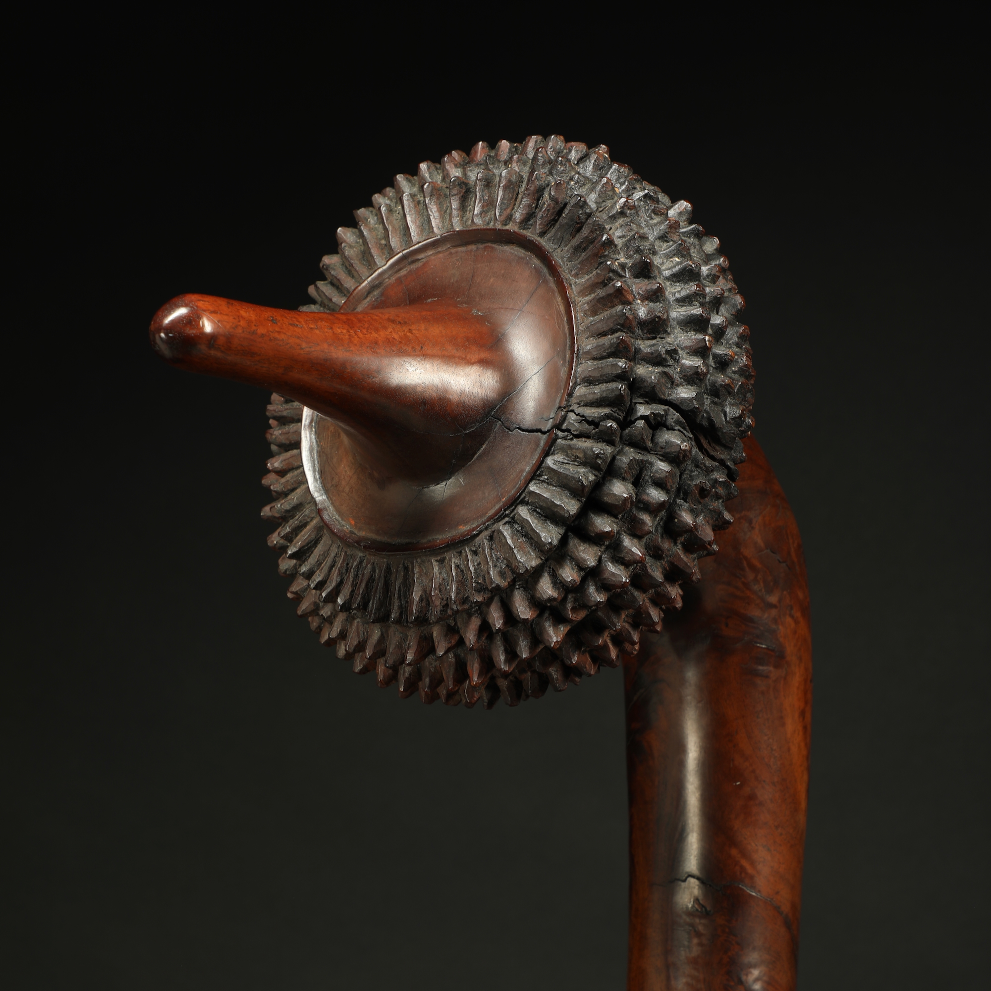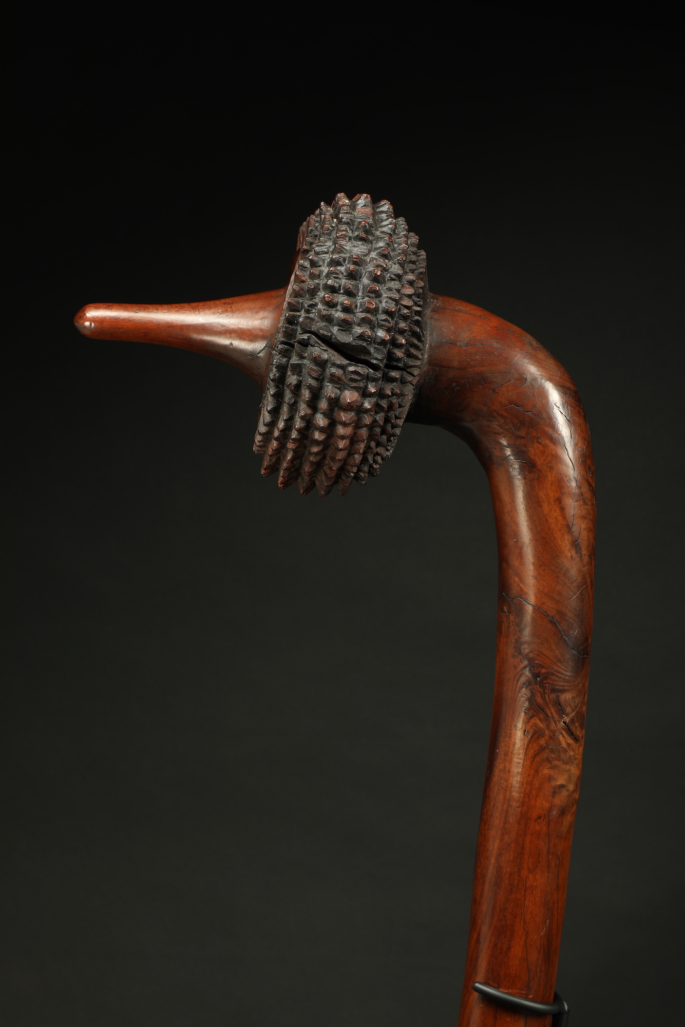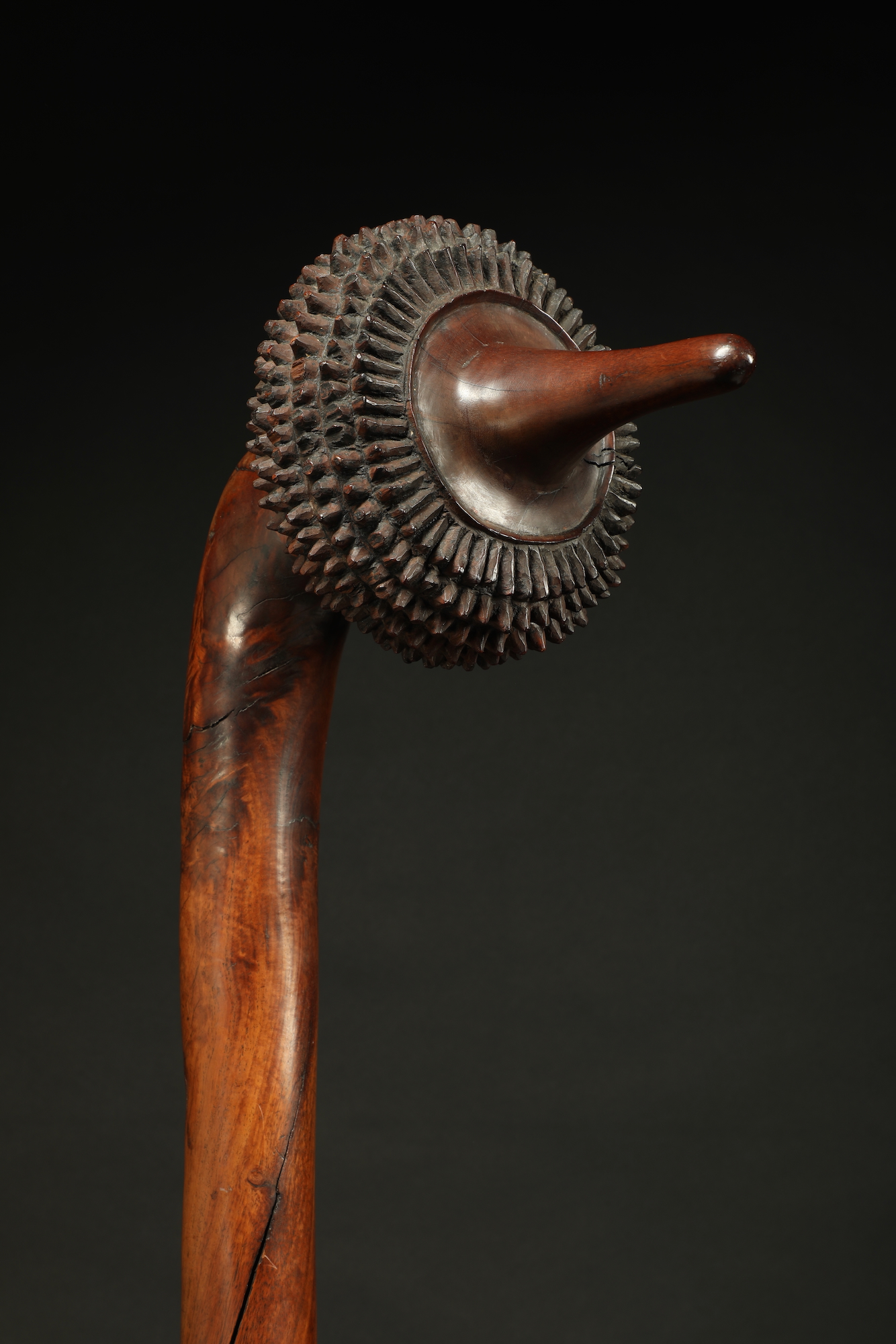 A fine and early Fijian Totokia war club with a large spiked head. The condition is quite good with minor spike losses and some stable cracks. The excellent patina is dark and glossy form age and use. Mounted on a custom metal stand.