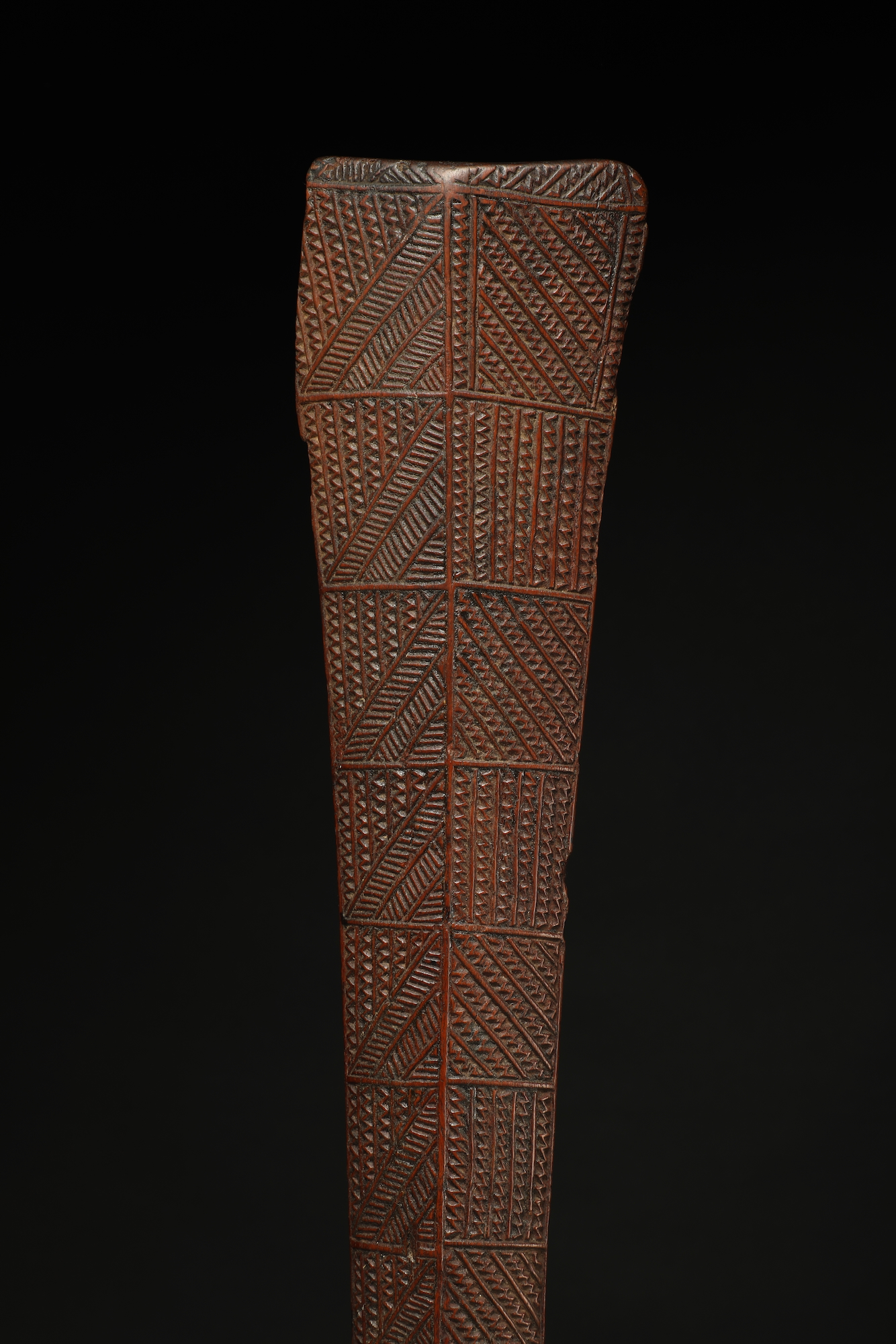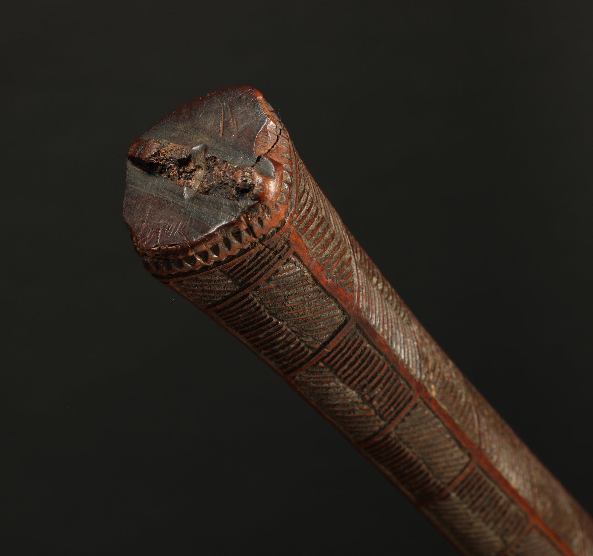 A very large and heavy Tongan war club with a good dark patina from age and use. The entire surface is covered with intricate carving, but there are no picture glyphs within the decoration. The top corner has an old loss that has a good patina on the chipped area. Mounted on a custom metal base.