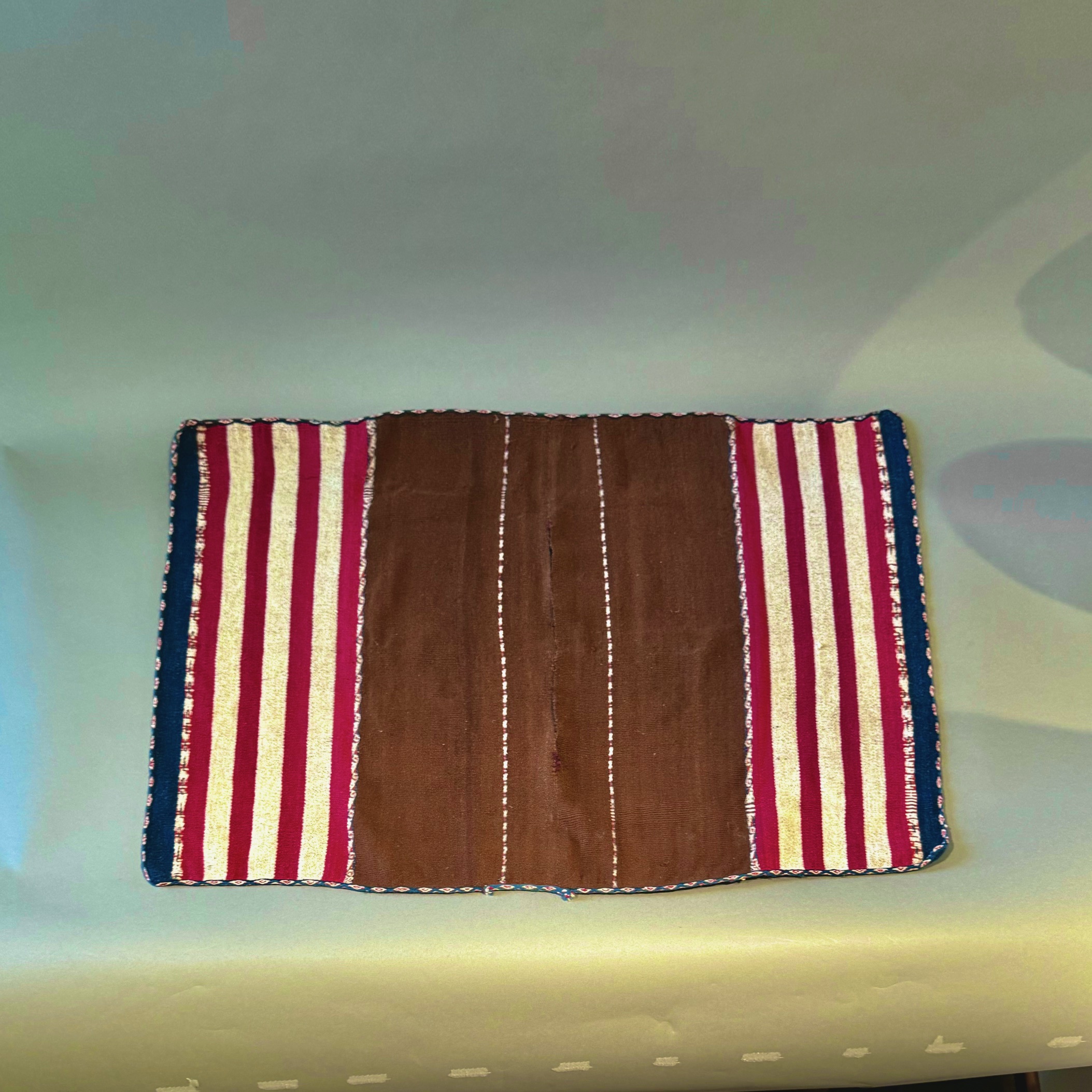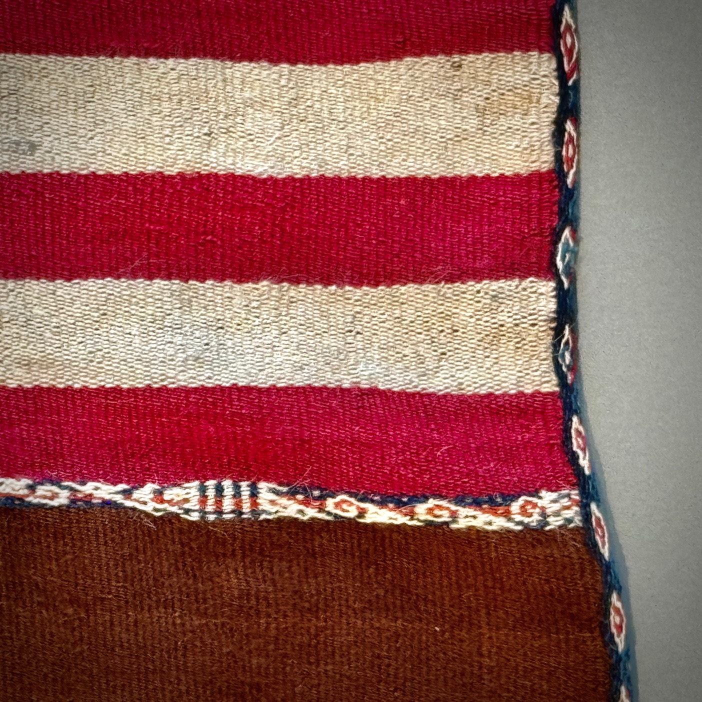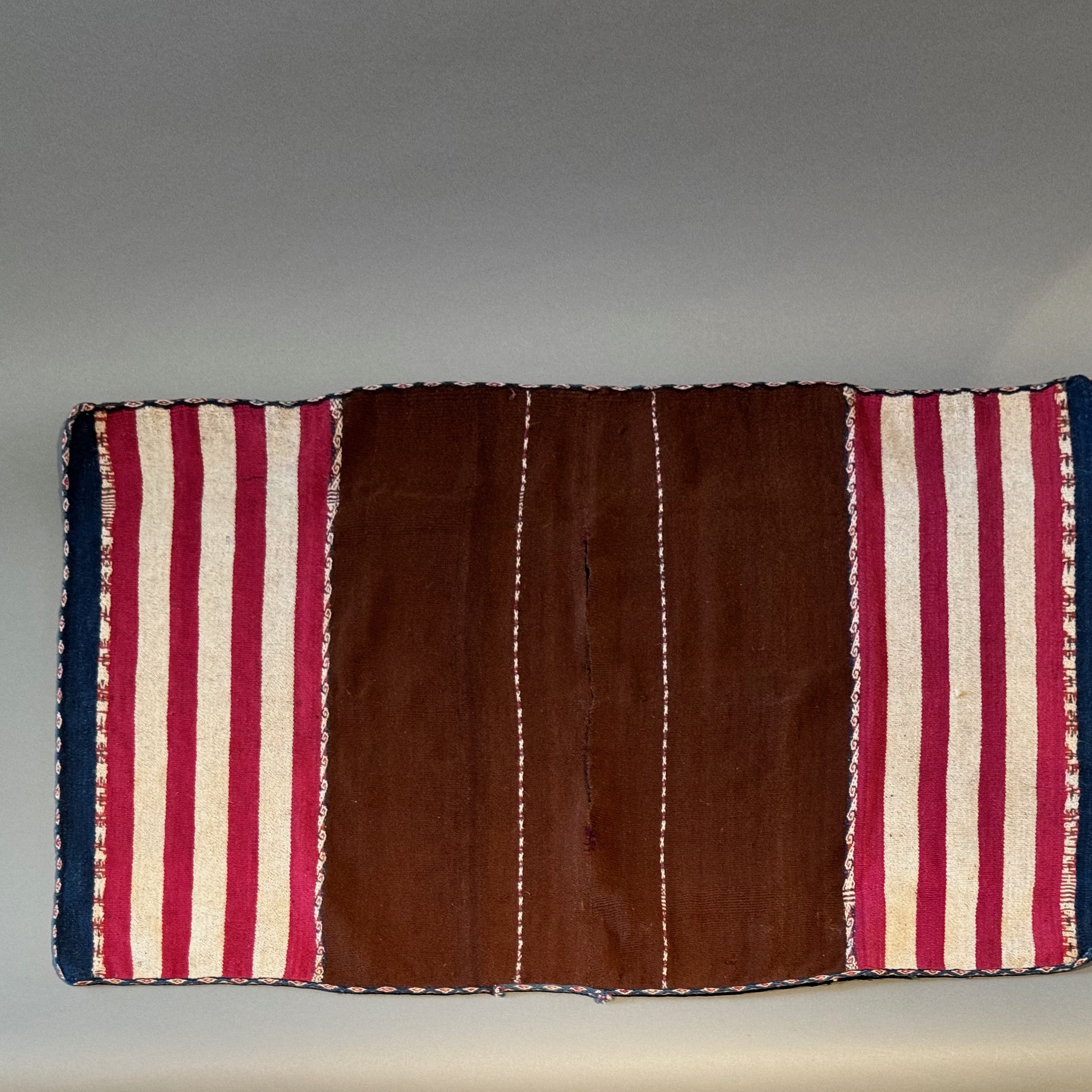 In many Andean areas, men wore such dazzingly artful ponchos on important ceremonial occasions. The mahogany brown central field appears to be the natural fleece or fiber color of a camelid, probably an alpaca. Note the colorful stripes of white, red and blue.