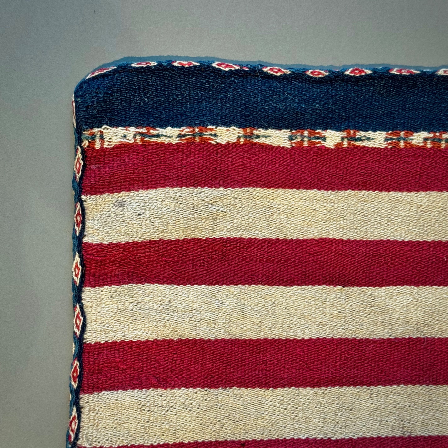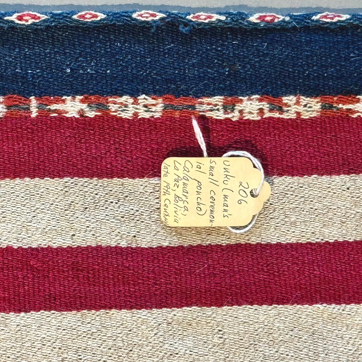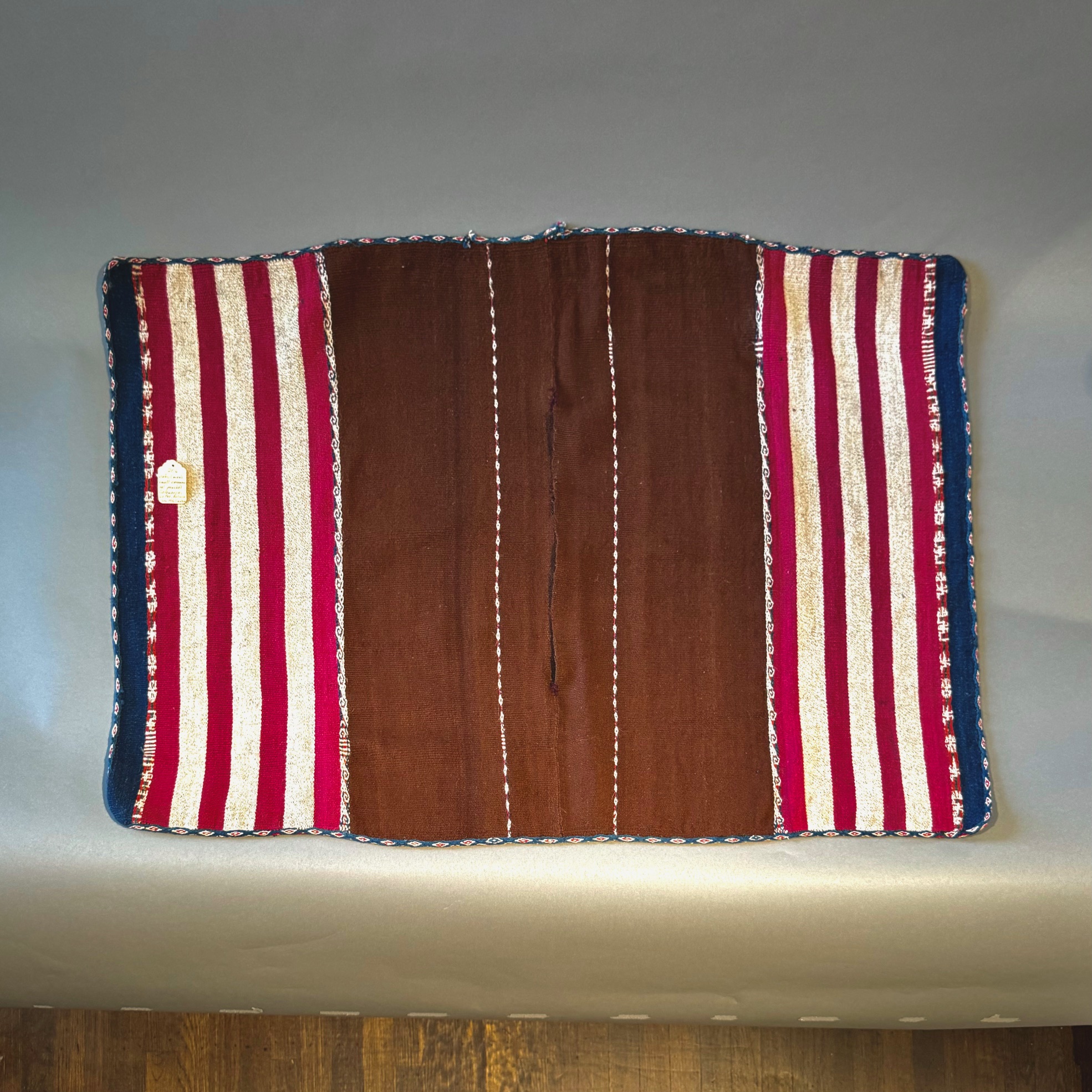 In many Andean areas, men wore such dazzingly artful ponchos on important ceremonial occasions. The mahogany brown central field appears to be the natural fleece or fiber color of a camelid, probably an alpaca. Note the colorful stripes of white, red and blue.