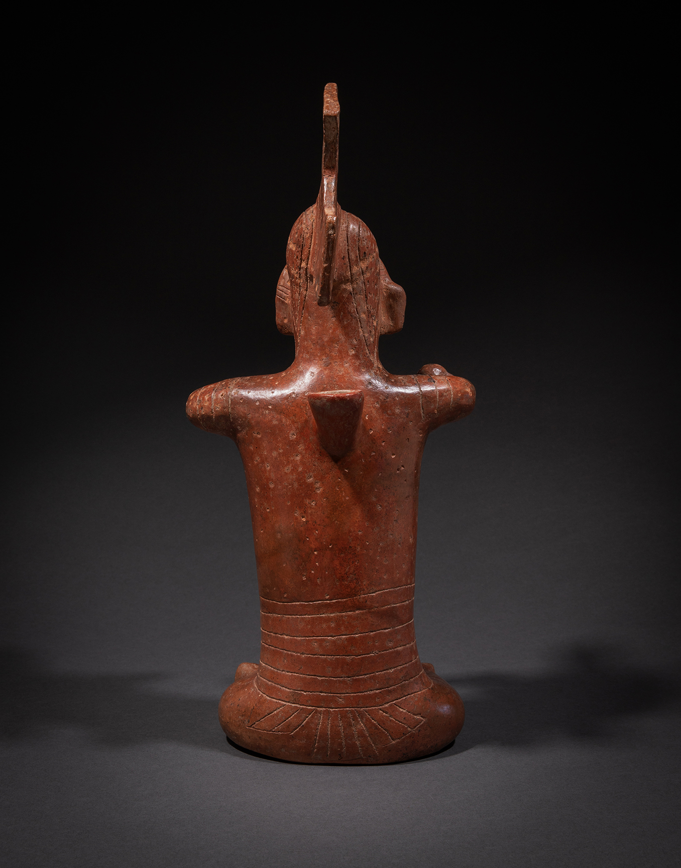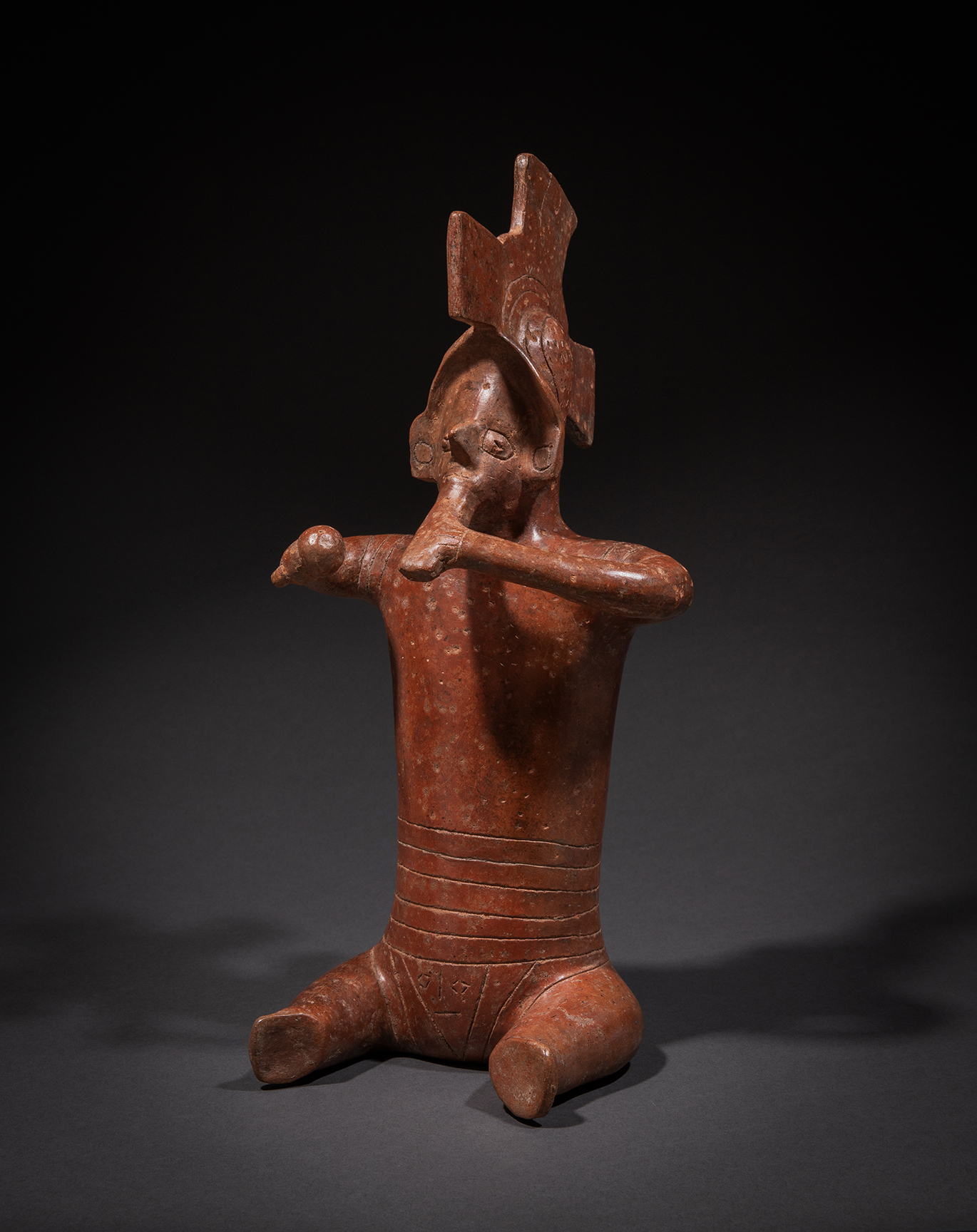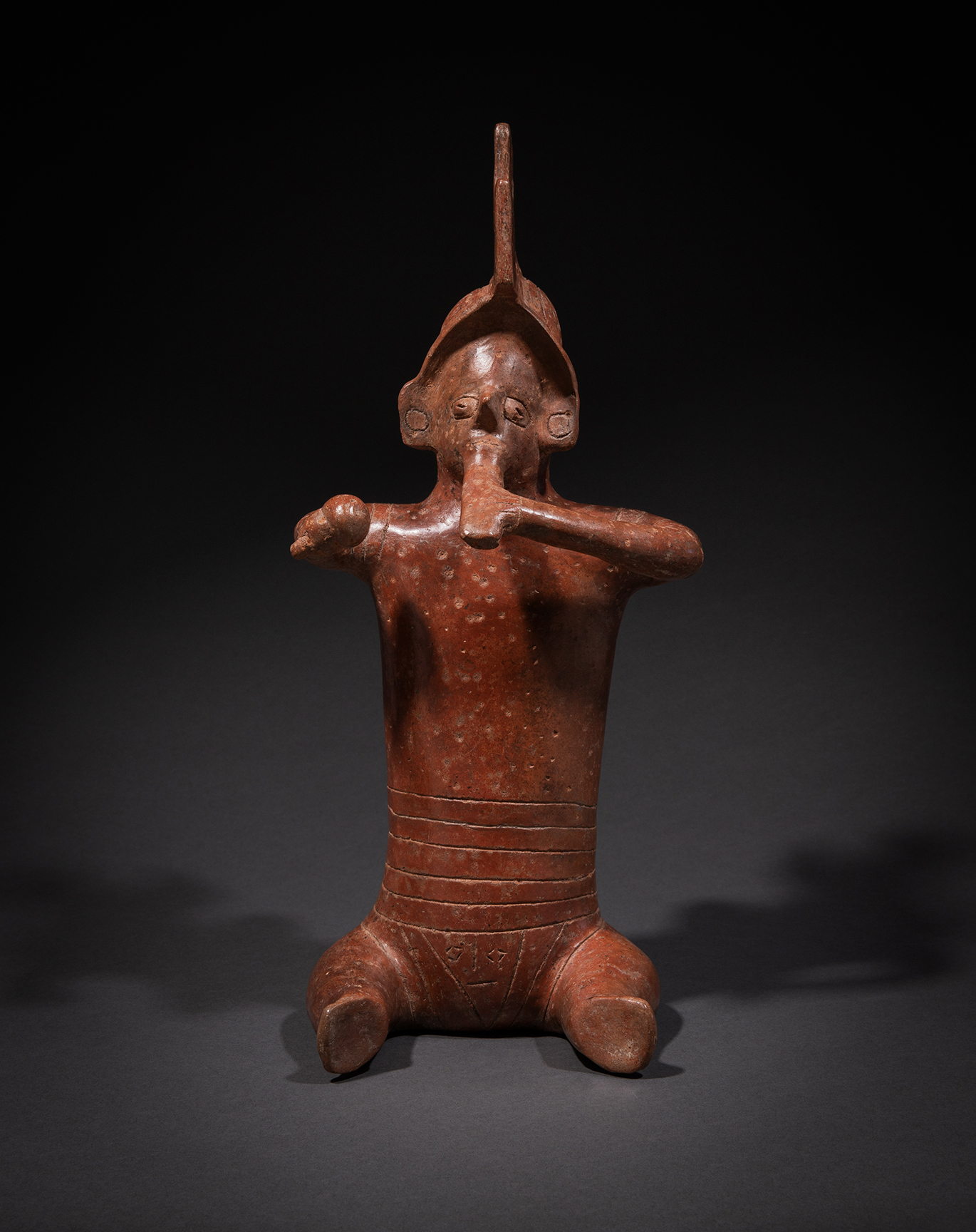 This tall Pre-Columbian seated Colima Musician wears a unique helmet-like headdress with its triple crest, which is usually associated with Colima ceremonial dancers. Holding a flute-like object in his left hand, and a rattle in the other, ear spools are incised on either side of the head, seven deeply carved grooves surround the mid-section, and a face is etched between the legs. A truly enigmatic figure!