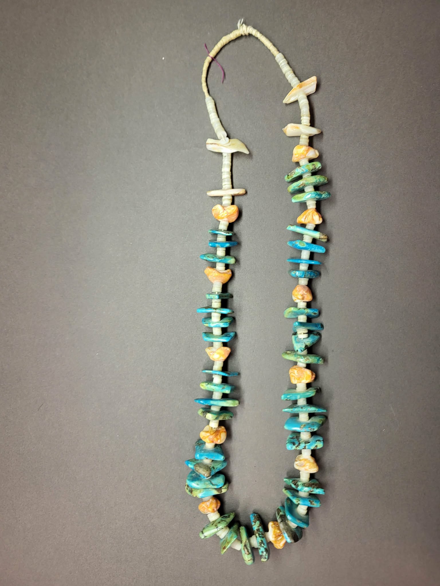 This necklace makes a statement, featuring large turquoise tabs and chunks of orange spiny oyster shell, connected by white heishe beads. Strung on linen, 25” with a 4-1/2” wrap section. Drop is 15” when worn.