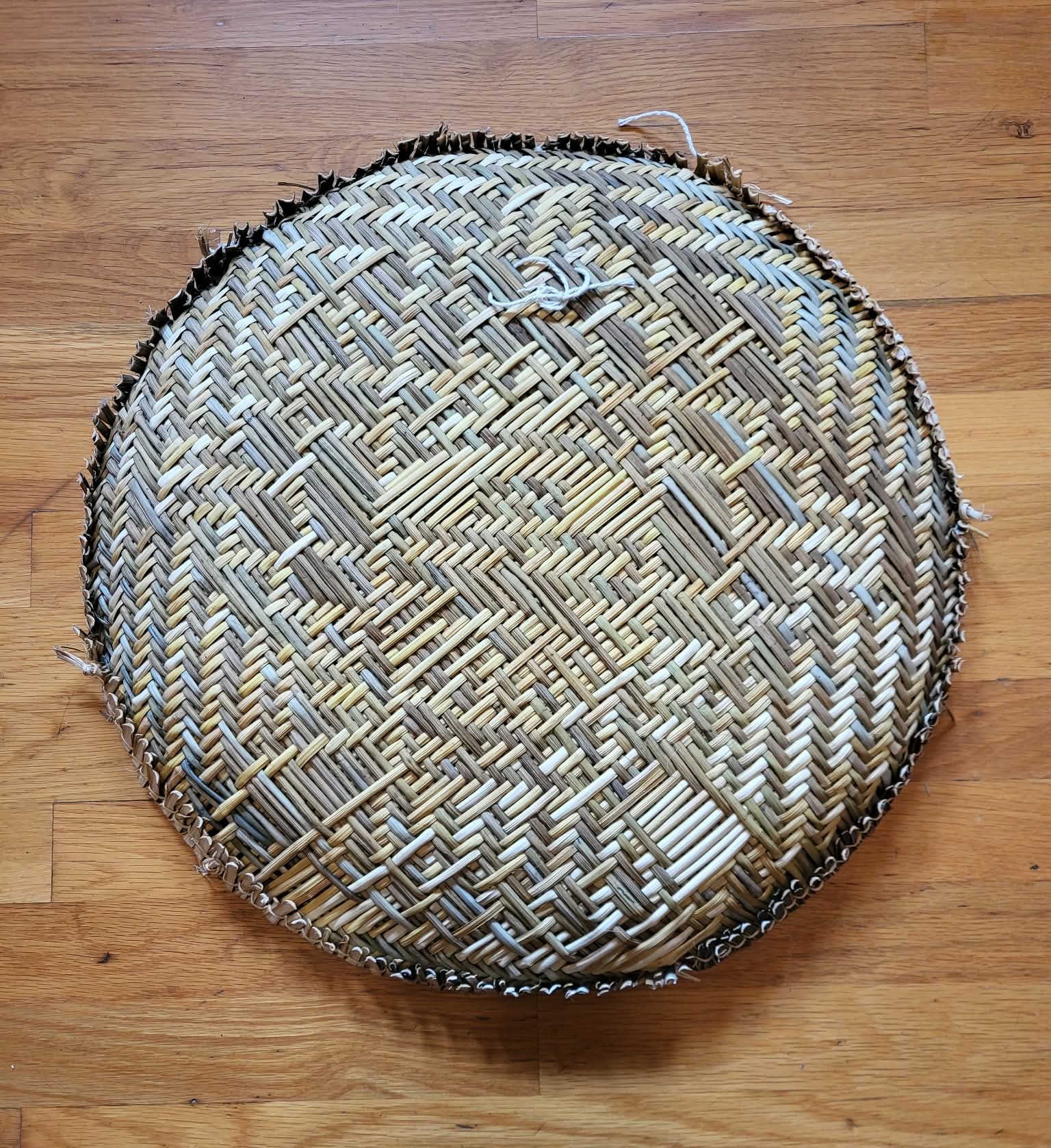 A very large sifter basket, 20 inches across, with a multicolor katsina design of the Butterly Maiden. Wicker over a natural rim. Aquired from the artist in 2016.