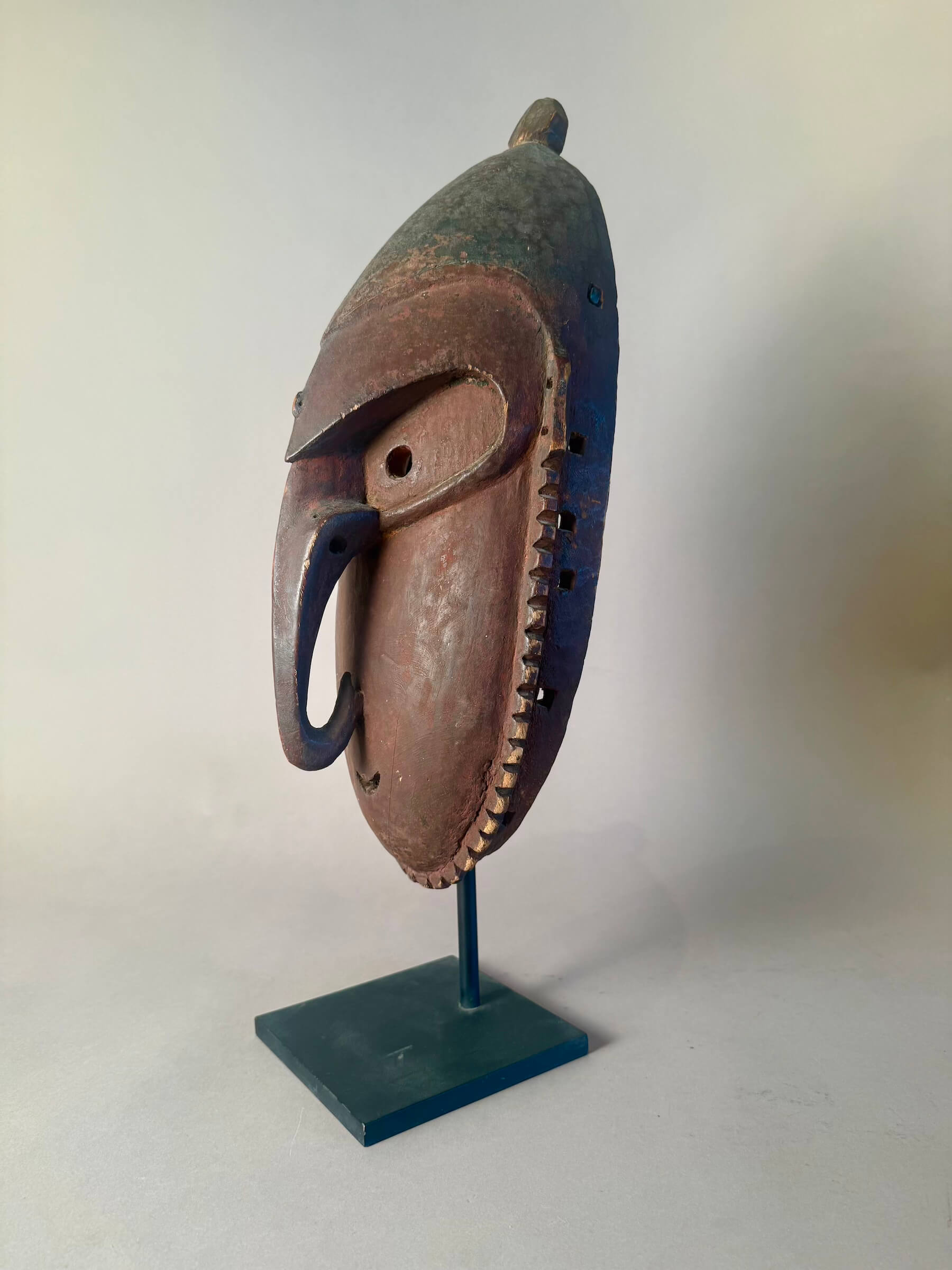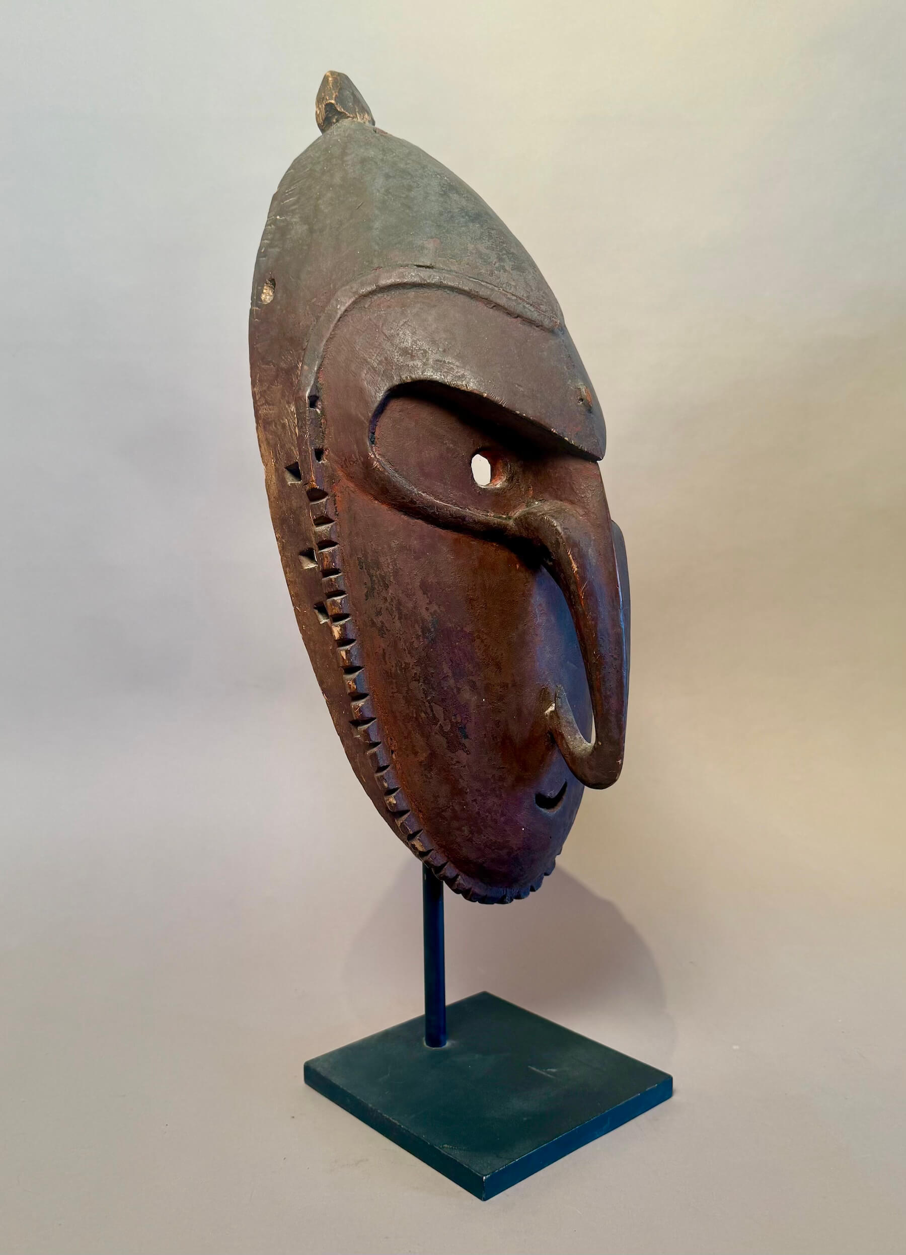 A classic Lower Ramu wood dance mask, with traces of reddish ochre pigment. Display base included.
