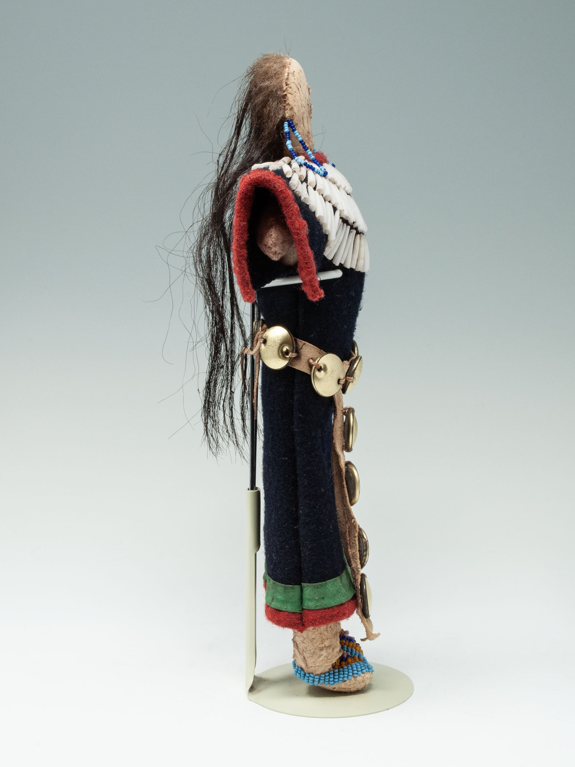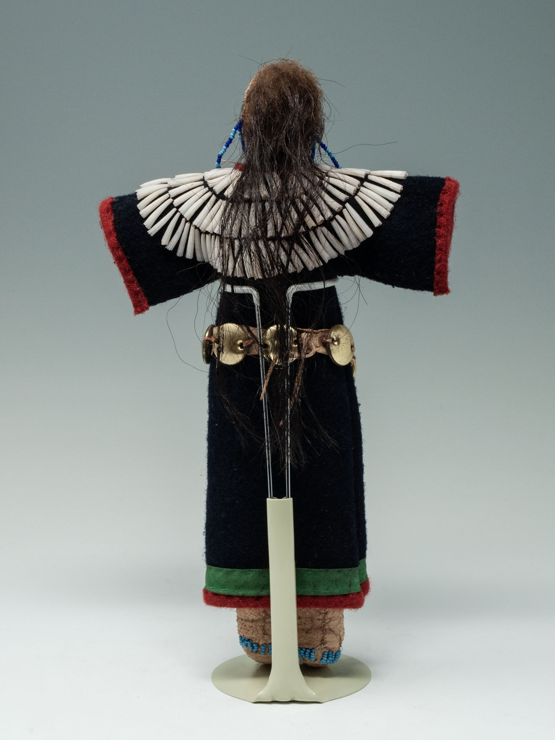 A cape of three tiers of dentalium shells is sown onto a black wool dress bordered in red and green wool. She wears a hide belt with round metal disks.