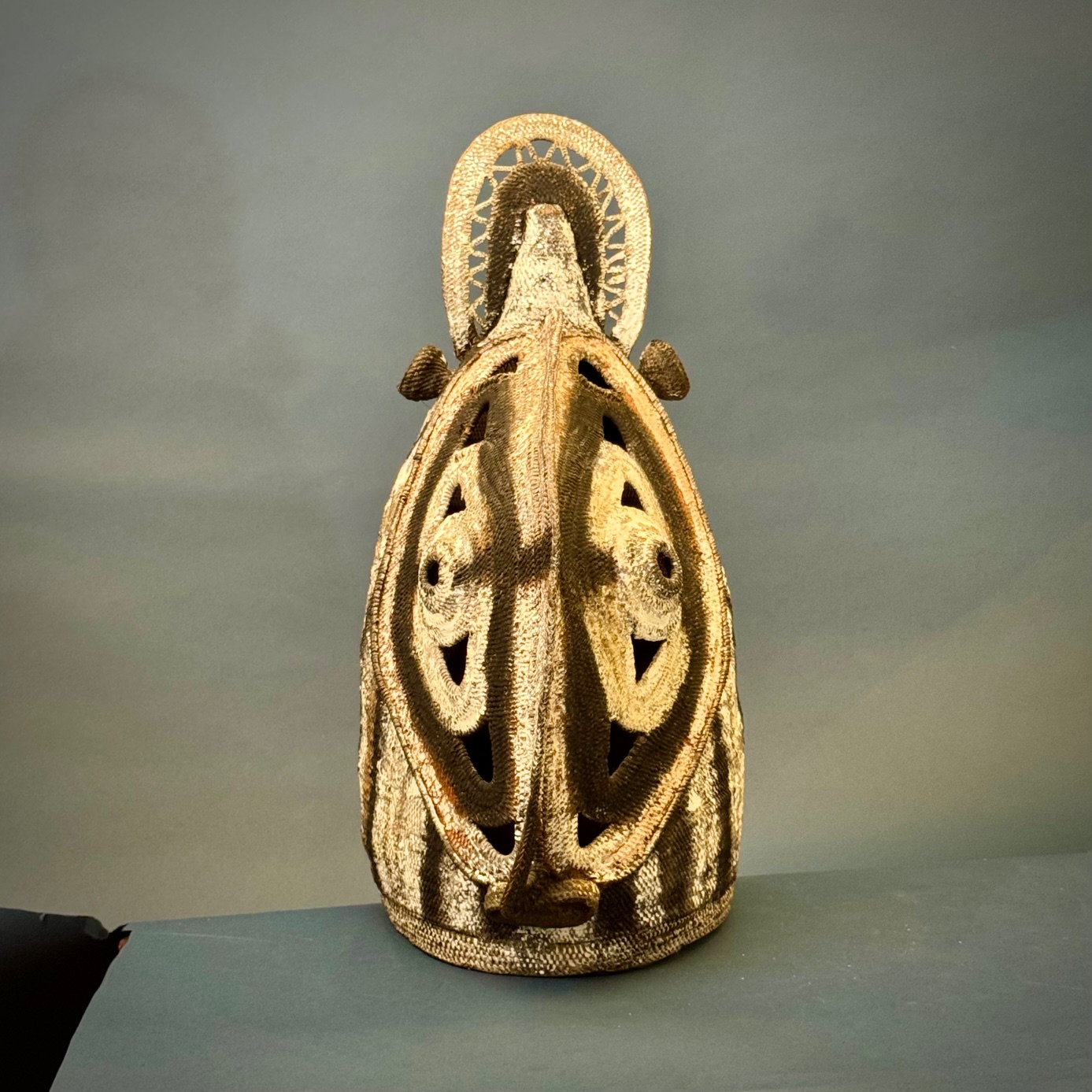 Black and white helmet mask of woven basketry; big and tall; rare type