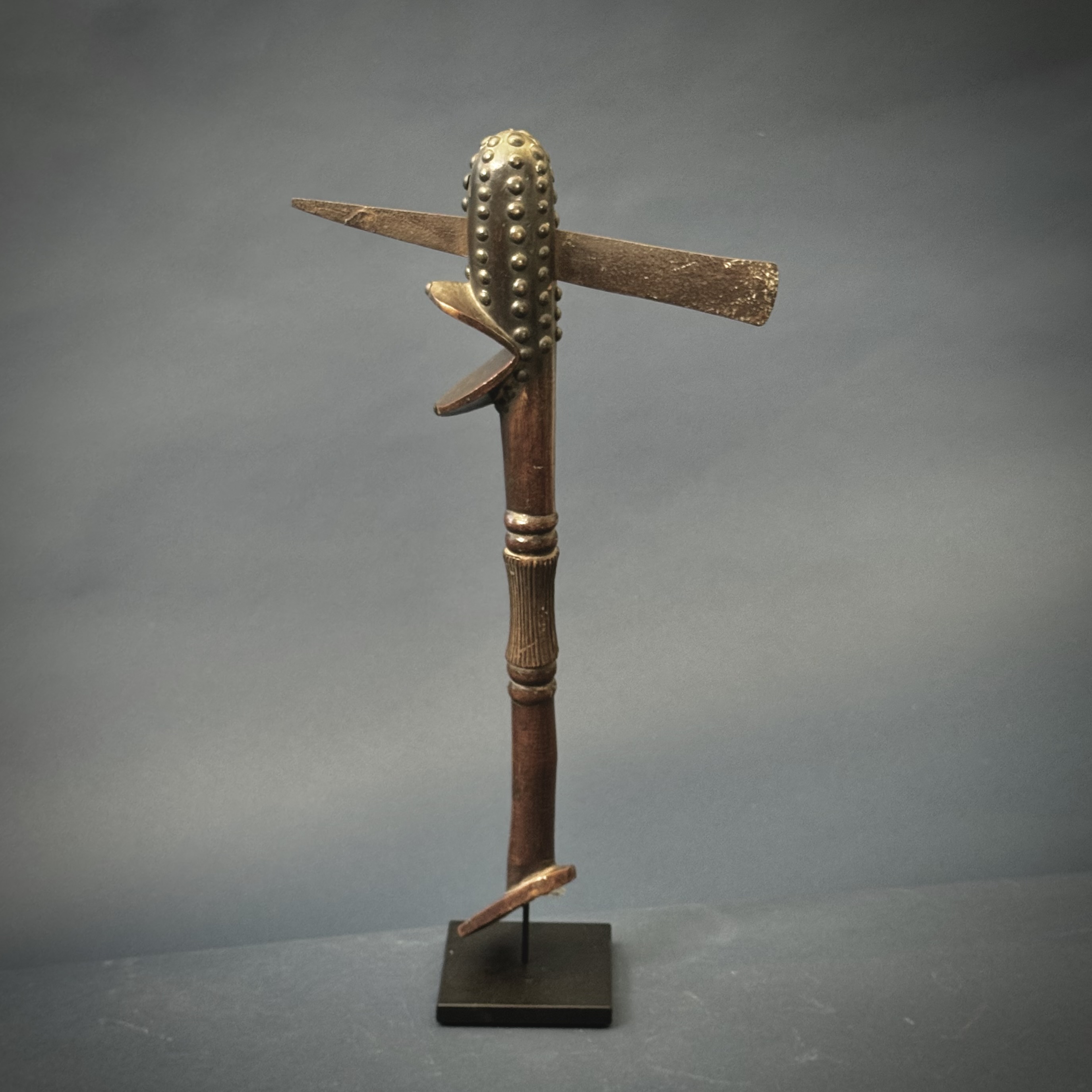 Ceremonial wood adze, abstract, with "mouth" and "foot"; diagonal angles, striations at grip; metal tacks and blade