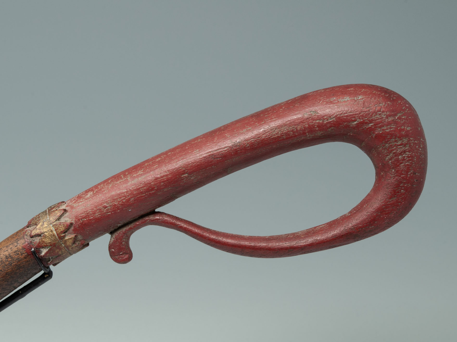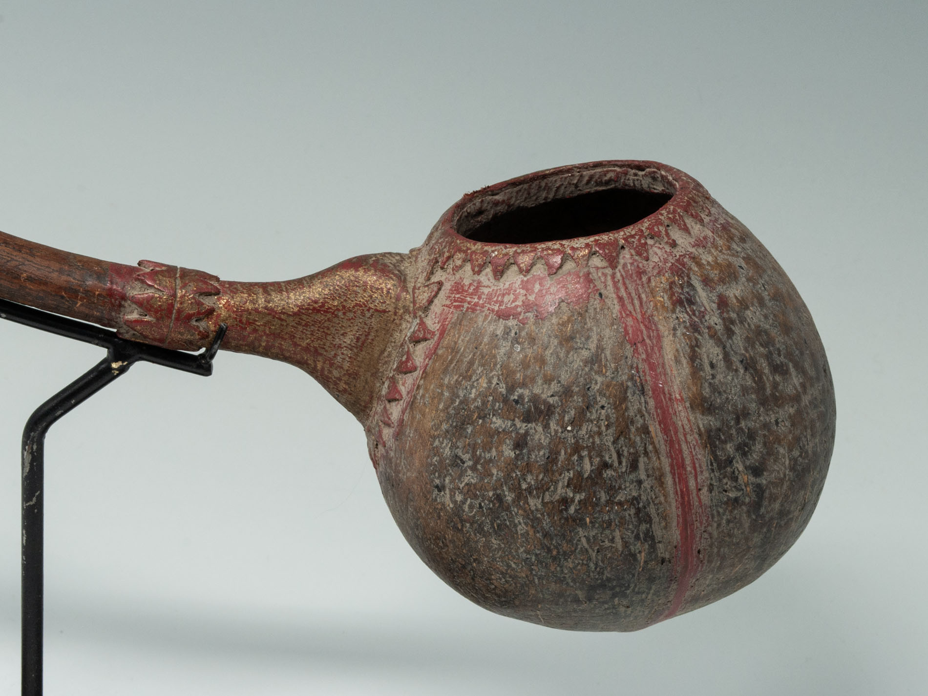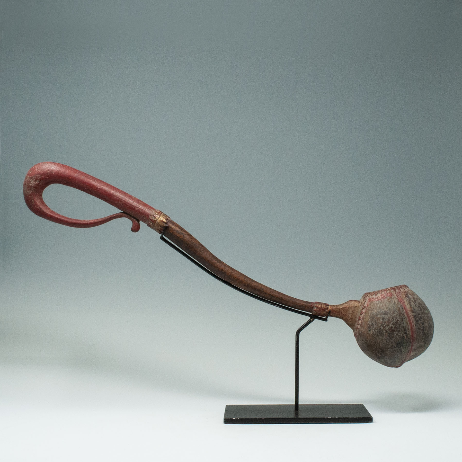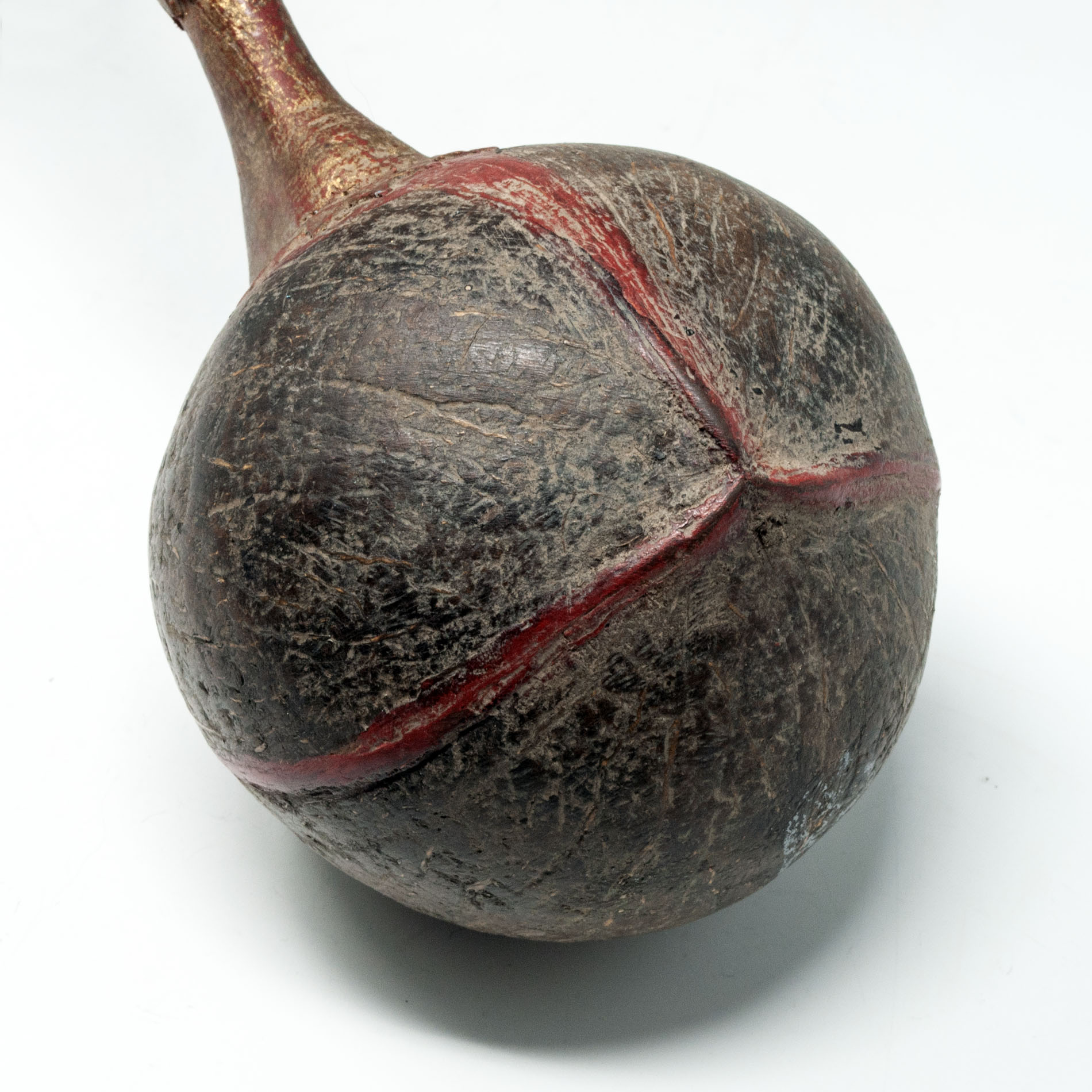 A long-handled ceremonial holy water ladle or dipper from Bali. The gracefully carved wood handle is painted a cinnebar red with gold painted accents, attached to a coconut shell bowl.
